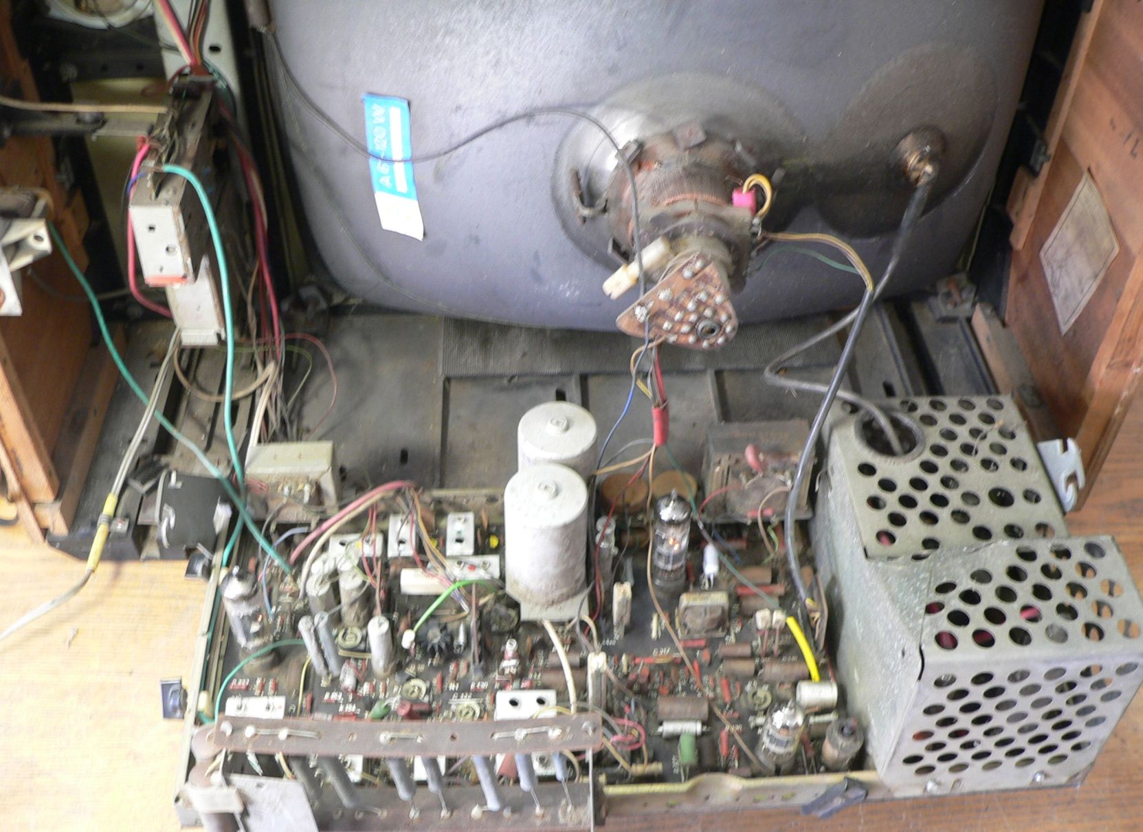 Takže stav po stránce vizuální nic moc - bez zadního krytu, špinavá a místy olámaná dýha, orezlé potenciometry, ulámané přední konce nožiček (to se bohužel asi podařilo mně - jednu jsem ještě našel). Po stránce funkční je v dobré kondici - ladí jak VHF, tak UHF, obrazovka solidní, jen špatný kontakt někde kolem PCF802 (při poklepu uskočí řádkový kmitočet). Ale jinak synchronizuje dobře. Svislou nelinearitu ani uvádět už nemusím.