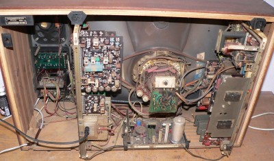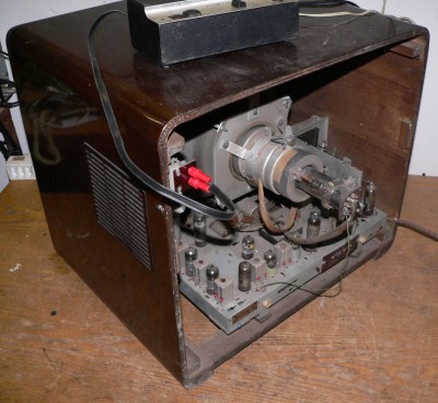 Konkrétně u tohoto kusu se bedýnka ještě leskne, ale má nuž nějaké oděrky. Synchronizace není úplně stabilní, zejména cca prvních deset minut se kmitočet oscilátoru postupně posouvá do konečné polohy. Obrazovka dobrá, zvuk perfektní, zprovozněn i vypínač na potenciometru hlasitosti. Postupem času vyměněna většina kondenzátorů v rozkladech (myslím, že i upravovány některé hodnoty), vzhledem k tomu, že většina oprav pak probíhala improvizovaně v místě provozu, není to úplně čistým způsobem (viz foto). Bez všech krytů, ale na druhou stranu myslím, že bych našel i návod k použití.