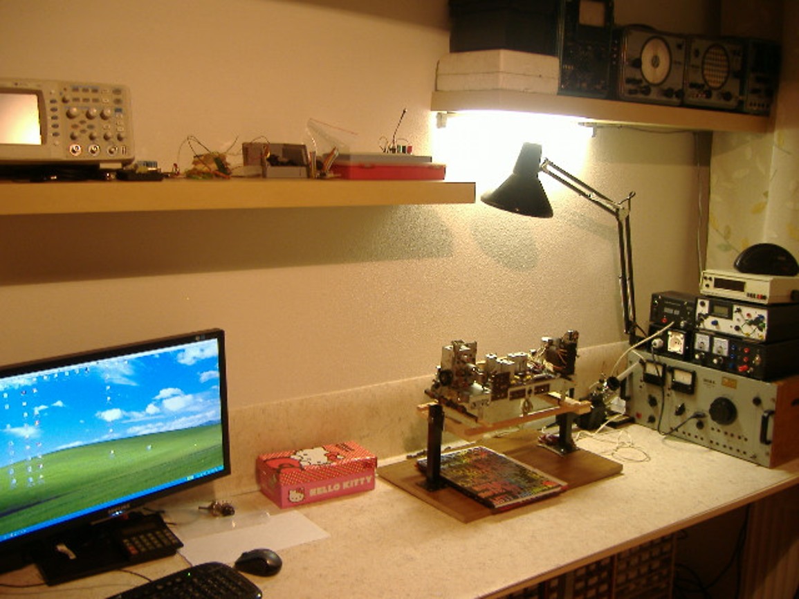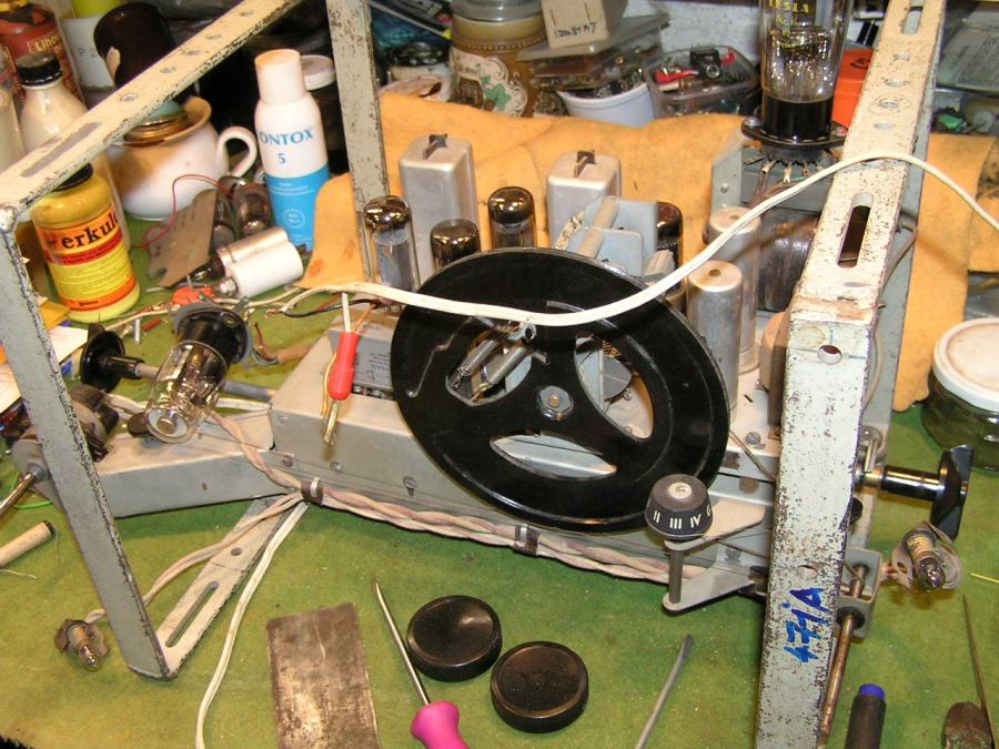 Nevím co z toho vyleze, snažil jsem se podle návodu vložit fotky, snad se to povede... Na fotkách by měla být tři různá šasi upevněná v té "kleci" z pásoviny (Kongres, Philips 905A a Lorenz 140W). Na dvou protějších stranách klecových pásů je vyvrtáno několik děr prům 6 mm a drážky, aby se to šasi dalo upevnit v optimální poloze. Dá se to celé různě otáčet, na záda, na hlavu i bokem, ale ne tam, kde z toho něco čouhá, např. u toho Kongesu čouhá vlevo ta konzola s potenciometrem, u Lorenze trafák. Na Talismany to bohužel není, protože jejich šásko nemá zespodu upevňovací závity, muselo by se to provést pomocí nějakých úhelníků... Na jednom z obrázků je v té kleci šasi přijímače Lorenz 140W, upevňovací otvory zespodu šasi jsou "cikcak", proto je pravé rameno klece jakoby sešikmené. Navíc je "nahoře" přišroubovaný příčný plocháč na kterém je upevněno síťové trafo aby se při otáčení pohybovalo současně s šasi, výstupák je na tom šikmém rameni. No, jsou jistěže i lepší pomůcky, ale tohle si může stvořit každý kdo má v dílně svěrák, kladivo a vrtačku. Mně to dělá dobrou službu už přes 20 let...
