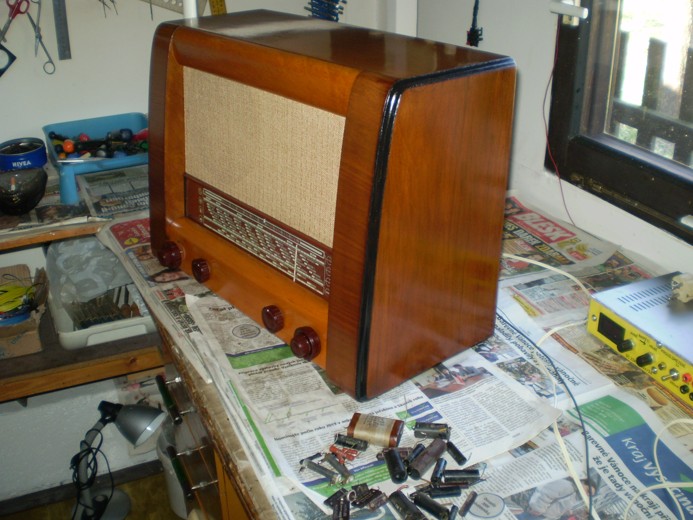 Rádio po větších obtížích s náhony ladění a pásmového ladění po výměně unavených pérek a pružin , lanek, promaštěných šňůrek a řady kondenzátorů a odporů je funkční. Zajímavá vada byla porušená izolace katoda /žhavení