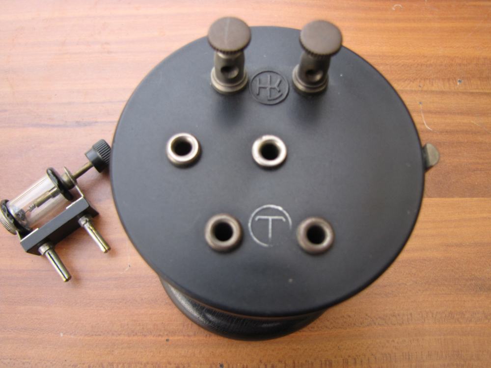 Přidávám několik snímků vzduchového ladicího triálu, výrobek málo známé české firmy KRAMER+Löbl, Továrna na elektrotechnické potřeby, majitel Hugo Löbl, Jablonecké Paseky. Ve sbírce mám jednu krystalku od tohoto výrobce (také viz fotky)... má někdo o této firmě více informací. Do jakých přijímačů se takový vzduchový triál montoval? Za pozornost stojí mechanické provedení: robustní konstrukce vany z duralu, díly vany jsou spojované pouze zatemováním na okrajích - žádné sváry nebo nýtování, na obou koncích hřídele solidní kuličková ložiska, zadní uložení je axiálně seřiditelné šroubem s jemným závitem. Užuž jsem to chtěl dát pryč, ale pak jsem si všiml toho loga "KL" v kruhu na boku vany...