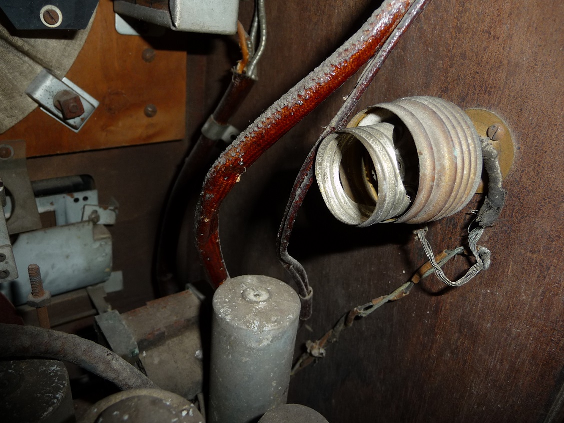 Znáte, ten okamžik napětí, než odejmete zadní stěnu radia. Na mě vyjuklo toto co je na fotkách, tu žárovku jsem tam strčil jen ilustrativně. Držáky původních žároviček jsou KO. Hezké, ne ?? Na zimu tam dát silnější žárovku a budou z toho i kamínka na ohřev rukou.