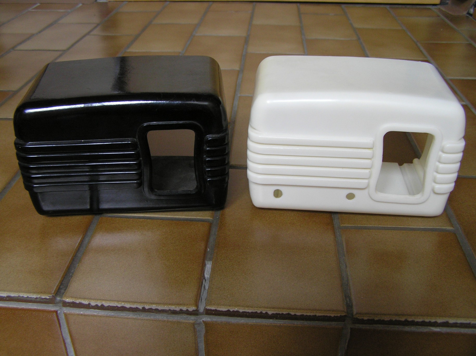 2) Americká varianta bílého bakelitu, Catalin, vyžaduje relativně složité dvoustupňové vytvrzování, navíc v tuzemsku, co vím, se tento materiál průmyslově vůbec nepoužíval. Dnes by už byl výlisek z Catalinu díky oxidačnímu stárnutí povrchu víceméně zažloutlý, rozhodně by nevypadal tak krásně nově.