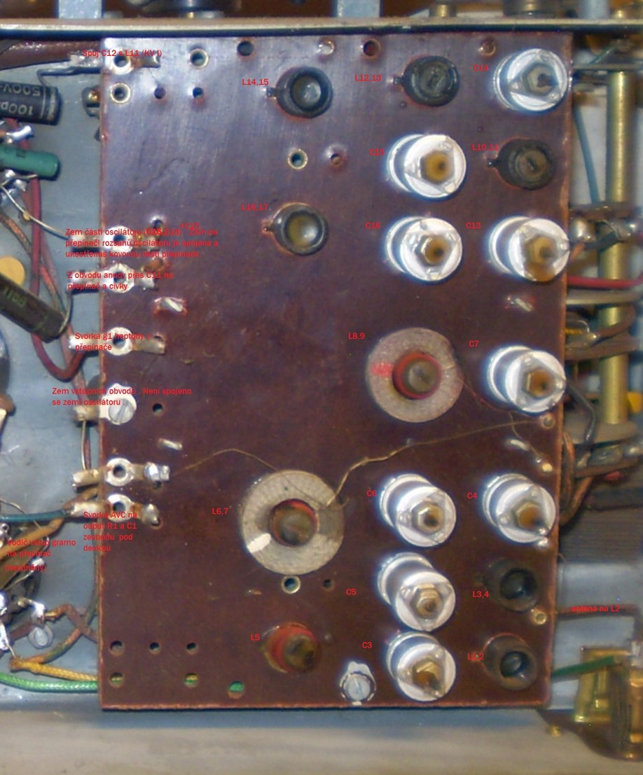 V příloze jsou obrázky jednak vlastní desky s označením přívodů, cívek a kondenzátorů ( číslování viz schema Kottek), jednak pohled mezi přepínač a lad. kondenzátor s označením vodičů k odpojení při demontáži (označeno OOO) a kondenzátorů v text. trubičkách 4pF ( vazba propustí na SV) a cca 10pF , který není ve schématu a je zapojen paralelně k C8 . Chybí ještě označení vodiče OOO k padingu , která je naletován na C10 nahoře a vede na přepínač. Třetí obrázek je přidaný plíšek vrtaný přesně na průměr 6mm přišroubovaný na původní a zajišťující fixaci hřídele přepínače a ladění v poloze kolmé na šasi a zamezující kroucení desek přepínače.Kdo by chtěl deskudemontovat jako já , odpojí všechny spoje vlevo na pájecích špičkách,vývod na anténu a šest vodičů v prostorumezi přepínačem a lad. kondem ( po odšroubování držáku přepínače a vyklonění desky) . Jsou to dva vodiče stíněné na přístupných špičkách přepínače , dva vodiče z lad. kondů C8,9 na přepínač ( vše označeno OOO) a poslední i s padingem ze sekce C10 nahoře.