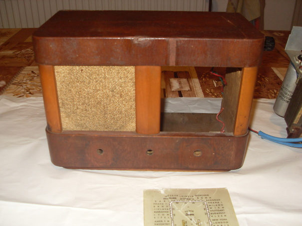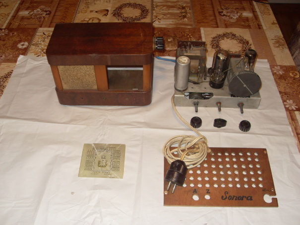 Pozor, nejedná se o přijímač Sonora dvoulampovka, předchůdce Sonorety, ale o superhet s plnohodnotným síťovým trafem, osazený ECH21, EBL21, AZ11. Nejsem si jistý, jestli osazení je původní, na přístroji jsou patrné stopy přebastlování. Reproduktor a výstupní trafo chybí, stupnice je rozbitá, ale odpovídá té na radiohistorii s nápisem Sonora SUPER. Skřínka je dřevěná, buď malosériová nebo kusově vyrobená, velmi hezky truhlářsky provedená. Nikdy jsem takovou v praxi ani na obrázku neviděl. Rozměry bez knoflíků cca 223 x 157 x 120 mm. Zadní stěna z překližky s ručně malovaným napisem Sonora.