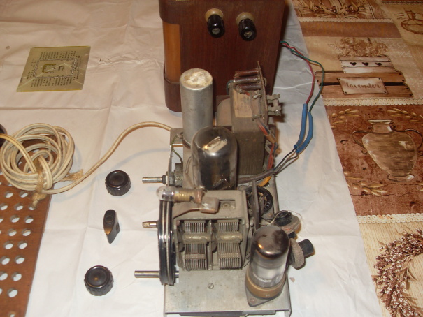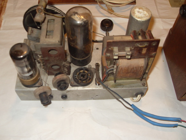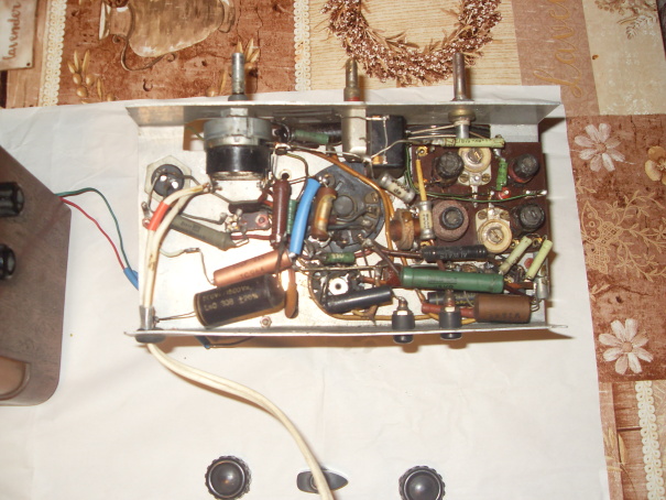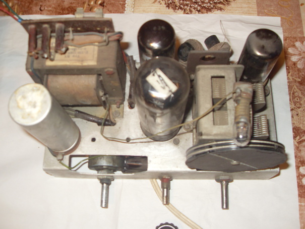 Přesně takto uvažuji. Má to ovšem duál a dvě vstupní a dvě oscilátorové cívky, nad šasi jakýsi mf filtr a la Romance, ovšem bez krytu a vypadanými cívkami. Není tam žádný promněnný zpětnovazební kondezátor, takže asi opravdu reflex bez zpětné vazby. Ovšem jak jsou ty elektronky zapojeny, nemám zatím představu, to lze zjistit jedině reverzním inženýrstvím, do kterého se mi příliš nechce, protože rádio je jednak velmi nepřehledně zapojeno, druhak je dost nepříjemně cítit, řekl bych, zatuchlou prádelní skříní. Na druhém obrázku je vidět bastl úpravu - nakřivo umístěné humpolácké přístrojové svorky, na které je přiveden vývod na výstupní trafo.