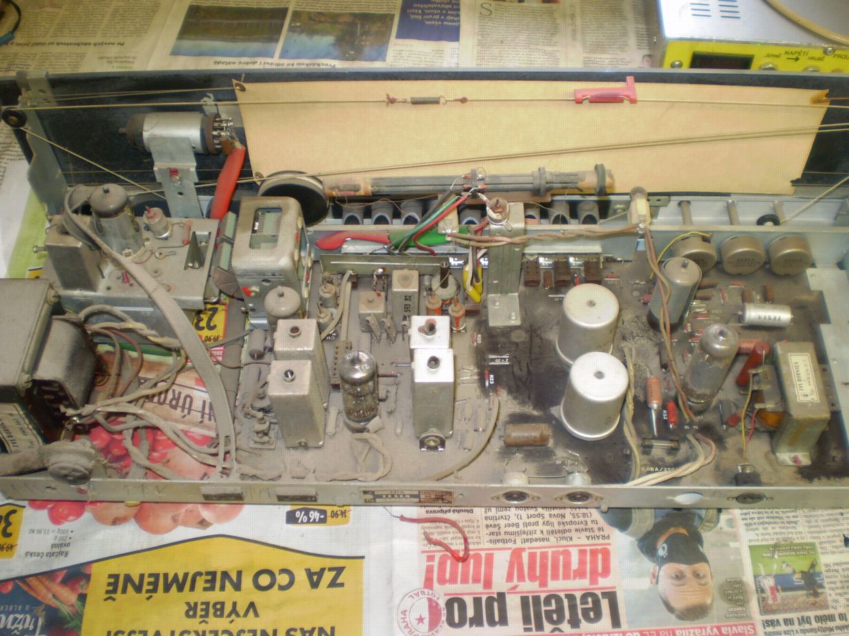 Tak opravdu, dokumentace až na drobné odchylky v součástkách a jejich osazení je totožná s větším množstvím rádií a gramofonů - jsou to ta, která mají stejnou "tvář" rádia zepředu. Kus, který jsem dostal , byl nalezen ve sběrném dvoře a jak později zjištěno , asi 25 let ležel otevřený na půdě zemědělské usedlosti, kam byl jako nefunkční odložen. Celkově je skoro kompletní kromě knoflíku potenciometru hlasitosti a reprobedýnky , bez velkých zásahů opravářů, skříň má pouze dva odštíplé kousky dýhy vlevo i vpravo dole . Vzhledem k silné vrstvě lepivého prachu jsem po delší době zvolil metodu očisty šasi v teplé vodě se saponátem ( komplet včetně traf , jsou impregnována voskovou hmotou) a následným sušením týden na kachlácích . Poté přepínače vyčistěny Kontaktolem a propláchnuty lihem zezadu . Povícero "hovňáků" popraskaných bylo vyměněno, nefunkční selen