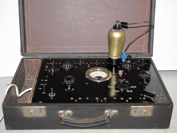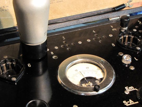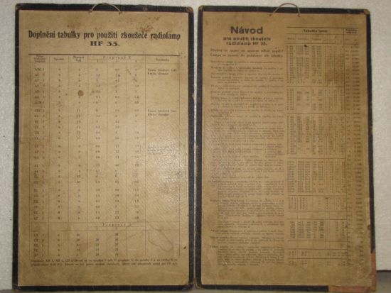 K mojí poznámce na Knize vzkazů: Zkoušeč elektronek HF-35 z roku 1935, podle všeho je v původním stavu bez jakýchkoliv pozměňujících zásahů. Součástí jsou tabulky optimálních hodnot pro jednotlivé typy elektronek (horní fotografie) a další informace k měření - která objímka, kam připojit kablík, polohy přepínačů atd...