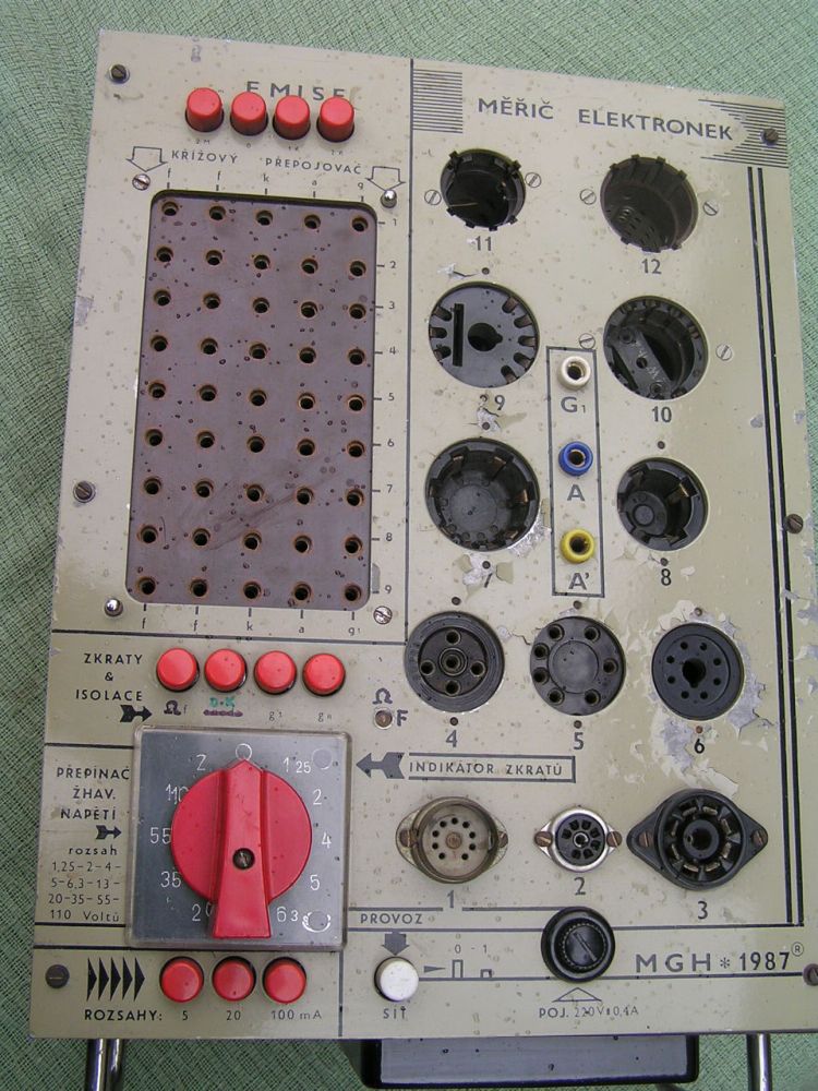 Před dávnem, v r. 1987, jsem si podle Amatérského rádia postavil vlastní měřič elektronek, toto jsou fotky z nedávné doby, pravda, je teď už trochu odrbaný, ale za ty roky udělal hodně dobré služby. Na třetím snímku je nejdůležitější součátka měřiče - tzv. křížový přepojovač. Pole se přepojuje zasouváním banánků... Popis stavby byl otištěn v Radiojournalu č. 3, zájemci mohu poslat sken stránek s popisem a schématem.