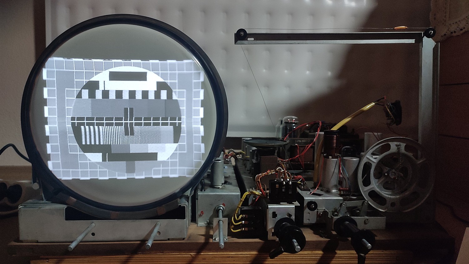 No a už išiel aj naštelovať obraz. Z prenosného DVDčka s dosť amatérsky nahranými monoskopmi a 1kHz piskotom sa u niektorých obrazcov dostáva brum "videa" do zvuku, u iných zase nie. Neviem, či je to zladením VF/OMF, keďže sa mi to obdobne správalo aj pri zapojení videosignálu napriamo do katody E6 a audiosignálu cez oddelovací kondík na poťák hlasitosti, a ako píšem, nepovažujem sa za experta do starej televiznej techniky. Teší ma, že to vie fungovať na Terru, že tam tie extra vstupy netreba, regulerne video sa pozerať dá.