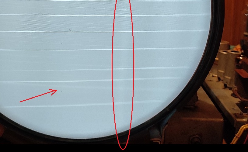 Tie vodorovné spätné behy mi až tak nevadia - oni sú takto prominentné až na plný jas, ten som pre fotku nastavil na maximum pri nastavovaní pozície ionovej pasce; zatemňovací zlepšovák z knižky pomohol ich zredukovať. Plný jas nepoužívam, jednak je potom obraz málo kontrastný aj na plnú amplitudu "RF OUT" Terra a s poťákom "kontrastu" (úrovni vstupného signálu) naplno, jednak tým neprospievam obrazovke.
