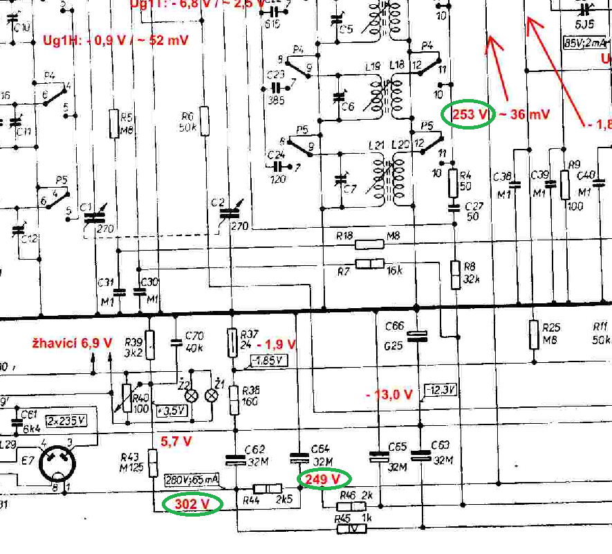 302 V bylo naměřeno před R44 (má být podle schéma 280V), 249 V bylo naměřeno za R44. A 253 V bylo naměřeno na spodním konci cívky primáru 2. mf obvodu. Rozdíl tam tedy je 4 V asi způsobený, že jsem to měřil v průběhu 20 minut. Kdybych měl horší měřák, možná bych ty rozdílné hodnoty nezaznamenal.
