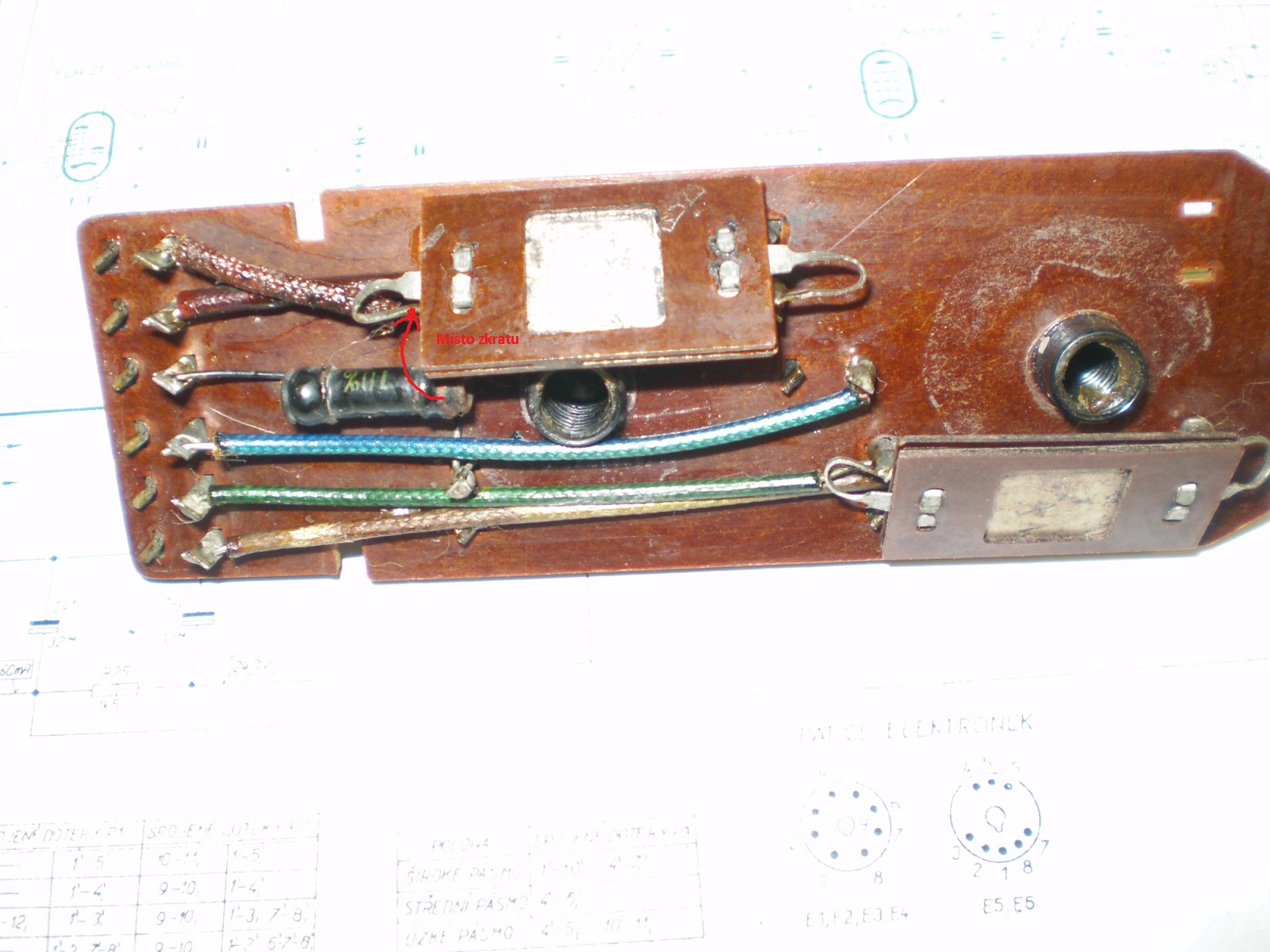 Destička ( z jiného kusu s jinou vadou ) je na obrázku s vyznačením , kde ta koroze zkrat způsobila.