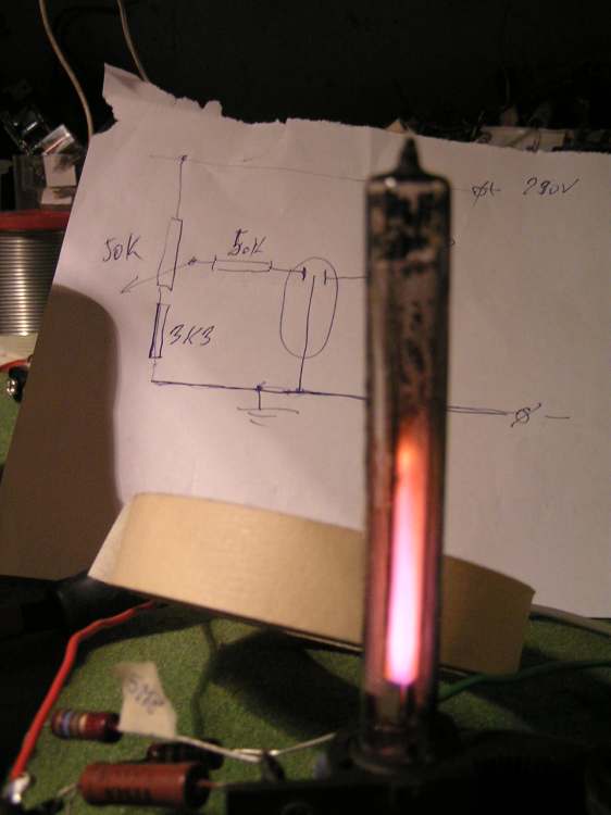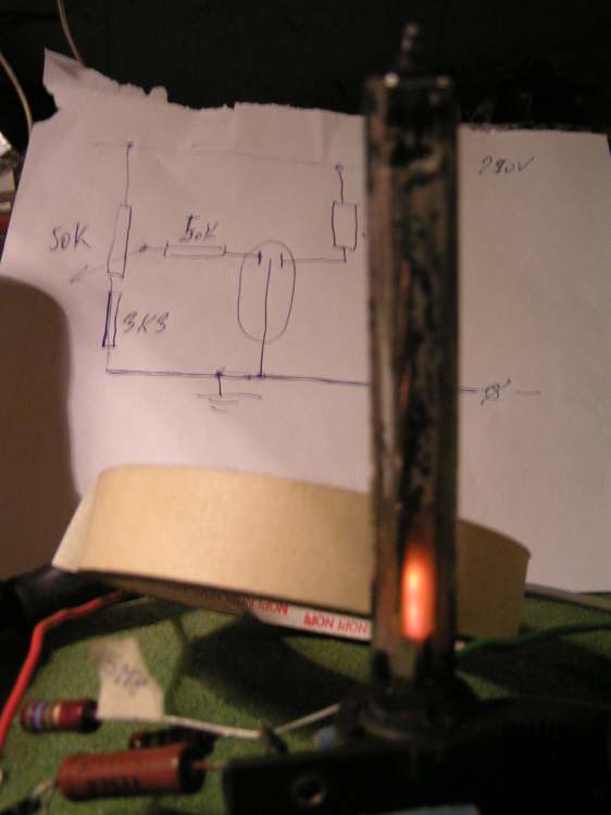 Jde samozřejmě o doutnavkový (neonový) indikátor vyladění, který najdeme i v několika přijímačích ČS výroby. V Radiojournalu č. 68/2009 je o tom podrobný článek, zde nabízím aspoň fotografie z pokusného zapojení doutnavkového indikátoru výrobce RESO. Indikátor na obrázcích tedy není zapojen do obvodů přijímače, změna řídicího napětí na "řídicí" elektrodě v tomto pokusu je vyvozena pomocí lineárního potenciometru.