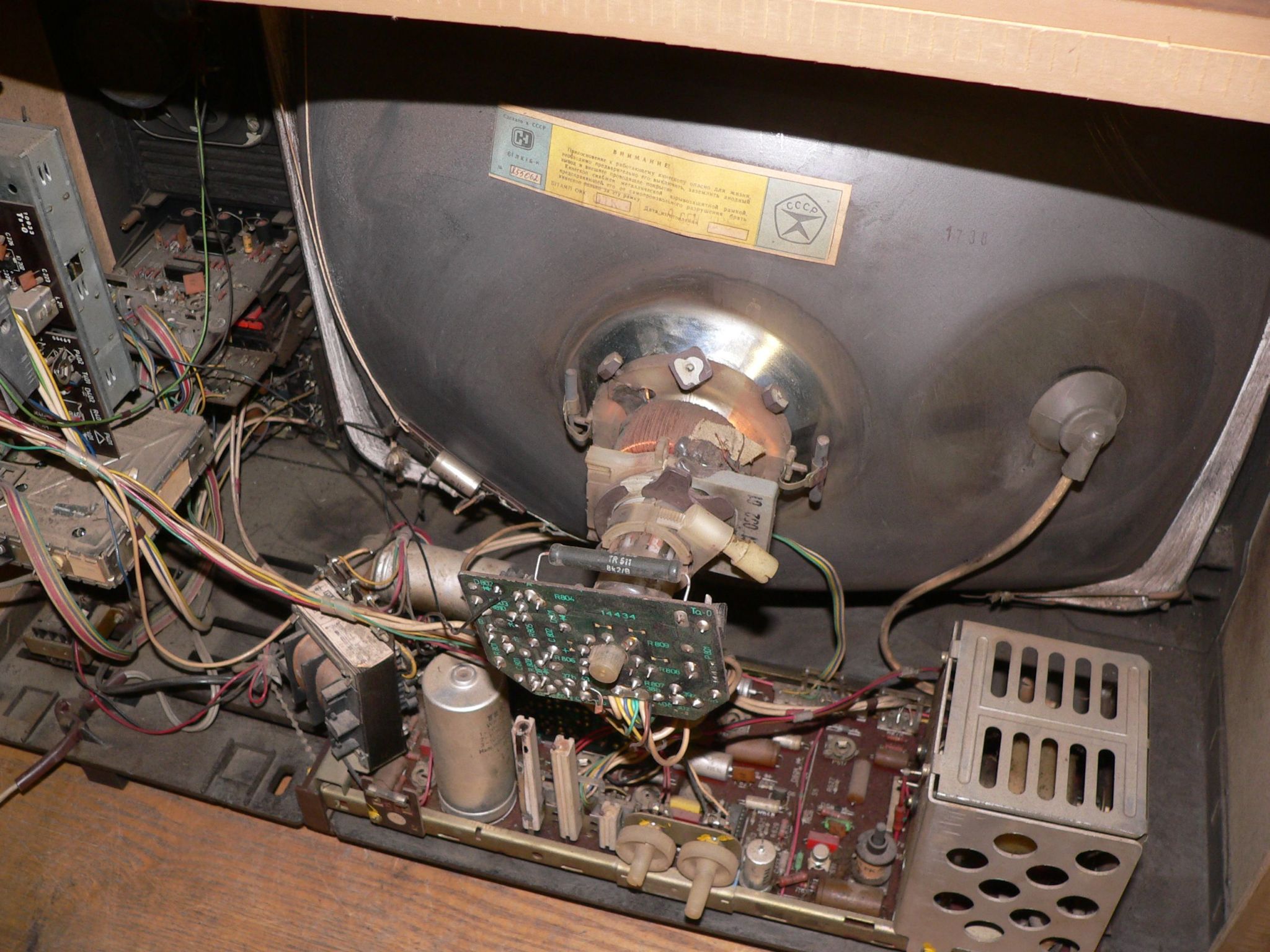 Teď dávám pryč ruského TEMPA 6. Na ruských televizích se mi jako klukovi-bastlířovi líbilo, že na všechno psali krom obligátního "Sdelano B CCCP" tay datum výroby. Takže při rozebírání jsem z elektronek a kondenátorů hned věděl jak je to staré. Naopak tragédií byly tyhle jejich plošné spoje. S nimi jsem přišel do styku, když jsem k vánocům od rodičů dostal ruskou stavebnici přímozesilujícího rádia (už nevím jak se to jmenovalo). Její součástí byly tři tišťáky (přijímač, předzesilovač a koncový zesilovač). Celé to bylo takové humpolácké a jak jsem psal, plošné spoje, jejichž vlastnosti a specifický pach si pamatuji dodnes. Ale zpátky k TEMPu. Tenhle je konkrétně cca z roku 1963, bedýnka se leskne, je kompletní, ale lak je popraskaný. Mezi ochranným sklem a obrazovkou je moucha, tlačítka potřebuji rozhýbat. Zvuk mimo obraz, nelinearita (výměna svitků bude doprovázena právě tím odlepováním spojů).