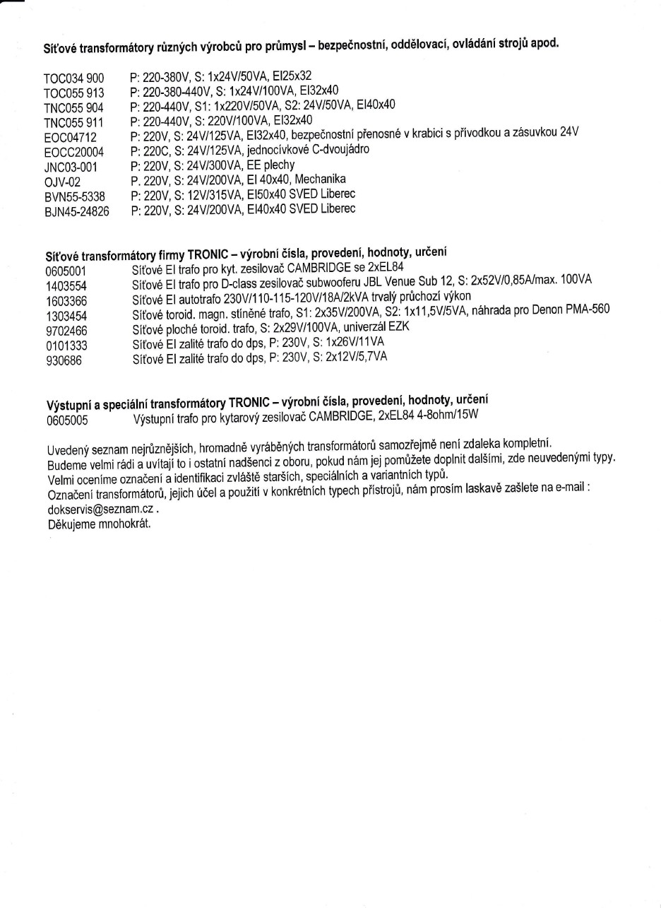 ale taky , že jsem ochotný po dotazu zaslat (ZDARMA na rozdíl od jiných nejmenovaných) konkrétní dostupné info k Vámi dotazovanému trafu, pokud ho najdete v tomto seznamu. Samozřejmě není to v mým schopnostech sem uložit. Mám to v excelu (už přes 1000 řádků, sloupce A-L) a postupně doplňuji, co najdu kdekoliv. Mám tam i různé odkazy na stránky současných výrobců.