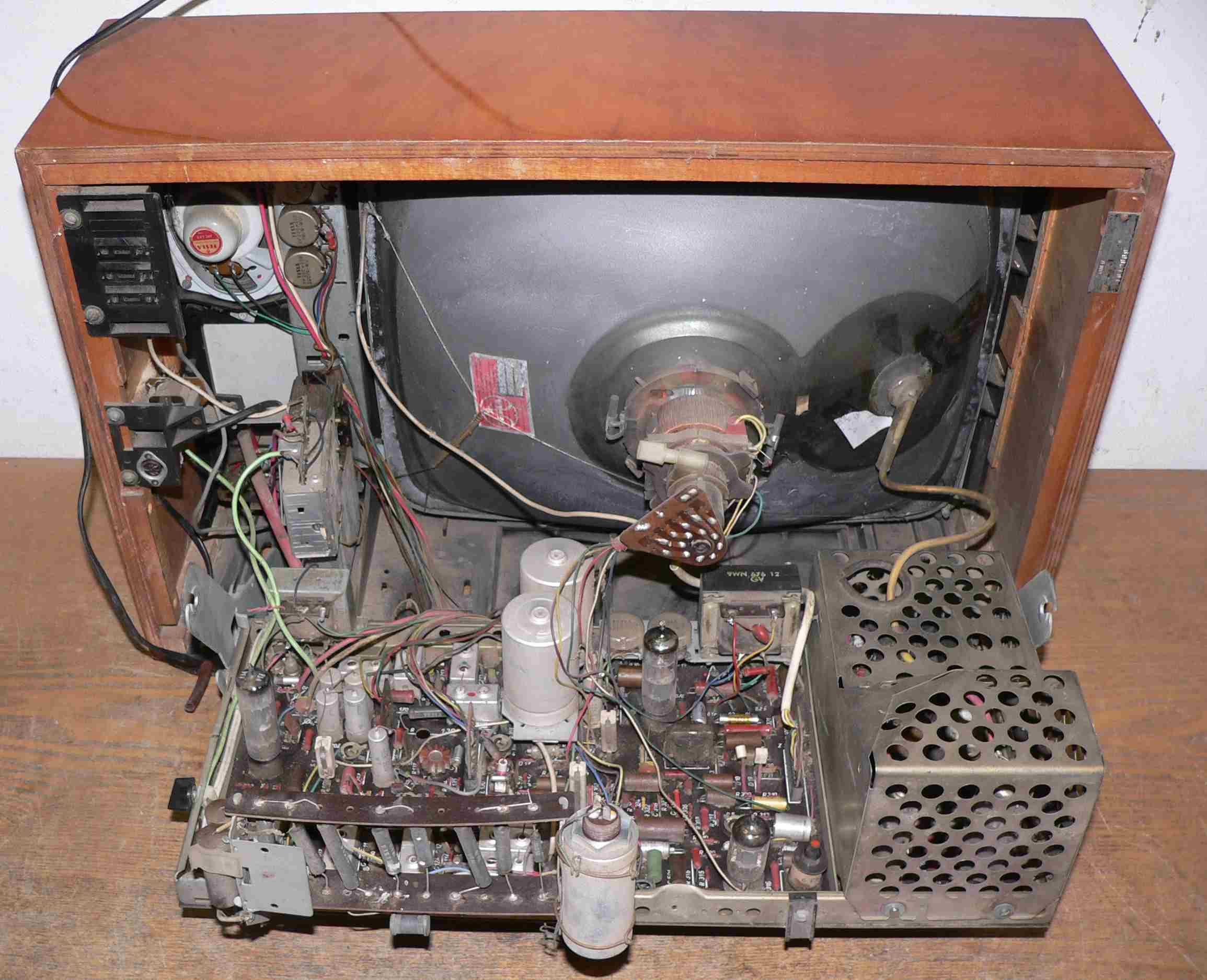 Pak tu mám 4245U Martino, to jsem získal až zde ve středních Čechách, v těch jižních se tehdy vyskytovaly prakticky jen Spoleta (těch jsem měl také několik). U tohoto kusu je vyteklá ale za pokojové teploty ztuhlá hmota kolem obrazovky, kanálový volič má mechanickou vadu - po stisku nelze otáčet s žádným hmatníkem (ladící kondenzátor je ale normálně pohyblivý, pokud není stisknuta žádná předvolba, lze s ním normálně ladit. Na něm schází tři hmatníky (nejsou ulámané dají se vyndat. Dále jsou provizorním způsobem nahrazeny oba filtrační elyty, všechny jejich části byly bez kapacity. Obrazovka má sice solidní jas, ale je rozostřená (co si vzpomínám, tak ty Spoleta byly také, zřejmě se do stavu obrazovek nepromítá ani tolik provoz jako výrobní série). Bedýnka je částečně rozeschlá, nic moc.
