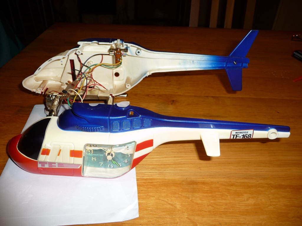 Dovolím si vás posunout do let dětských.. Vnuk dostal vrtulníček, ten prý v dobách dávných mimo toho, že ukazuje hodiny, i svítil či blikal a houkal. DPS je bez označení, 2 odpory a 1 kondík. A potom součástka, "trojnožec", kterou nemohu nikde najít, abych zjistil "co to dělá". Nápis co jsem přeluštil je v rámečku na 1 fotce. Poradí někdo? Děkuji za sebe i vnuka, který vrtulníček dostal darem... :thumbsup: