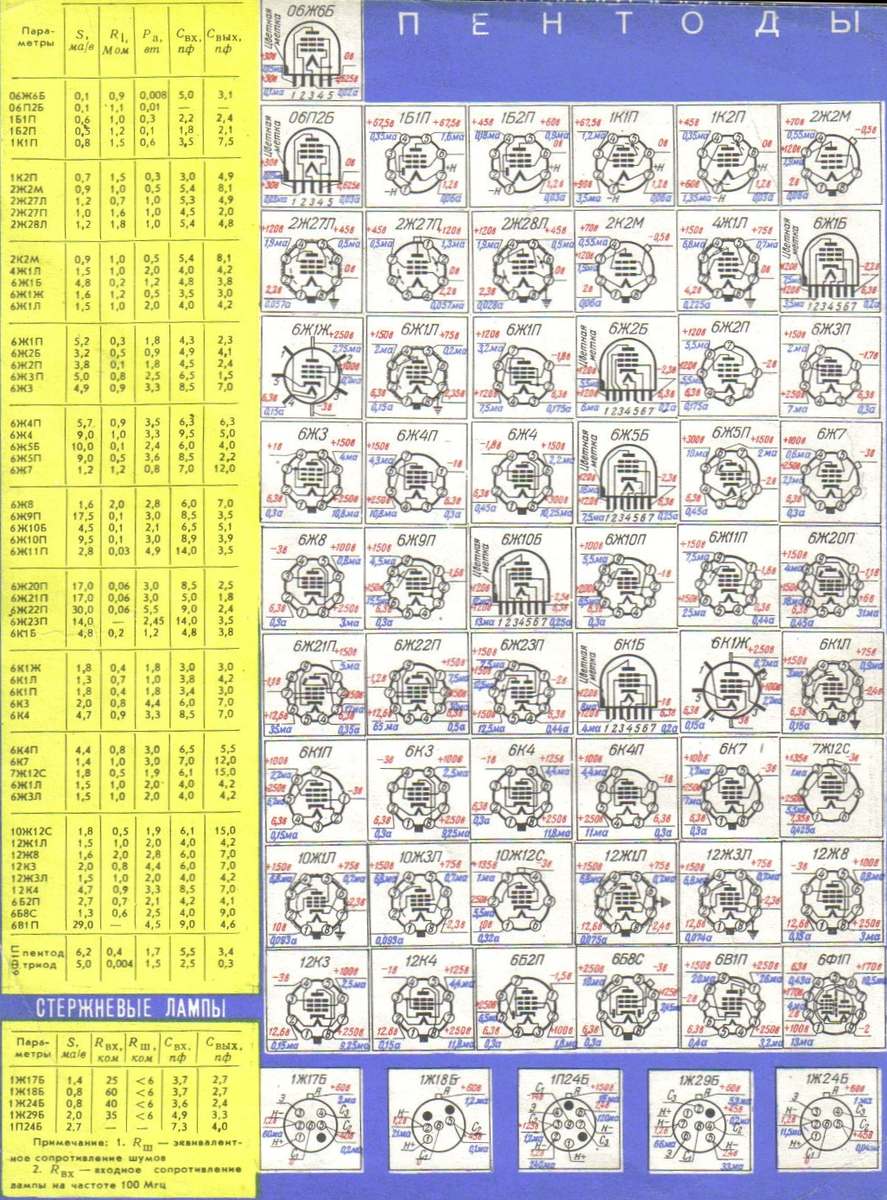 A také pro některé , co se setkávají s produkcí SSSR od diod přes pentody po tetrody, zapojení některých patic a označení: