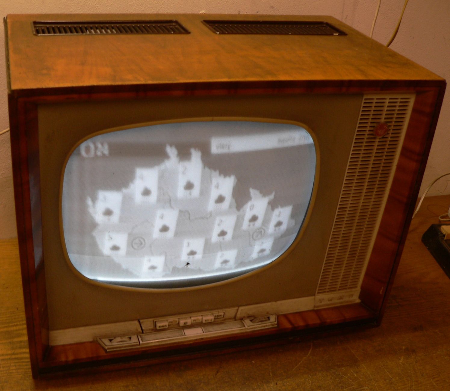Marcelu si nakonec odvezl výherce Aleše, myslím, že bude v dobrých rukou. Proto místo ní vystavuji Pallase. Obrázek této televize jsem vždycky považoval za stranově převrácenou, reproduktory přece všechny televize měly na pravé straně... Ale samozřejmě je to správně - ovládací prvky byly tehdy součástí typizovaného šasi, takže reproduktor musel vlevo.