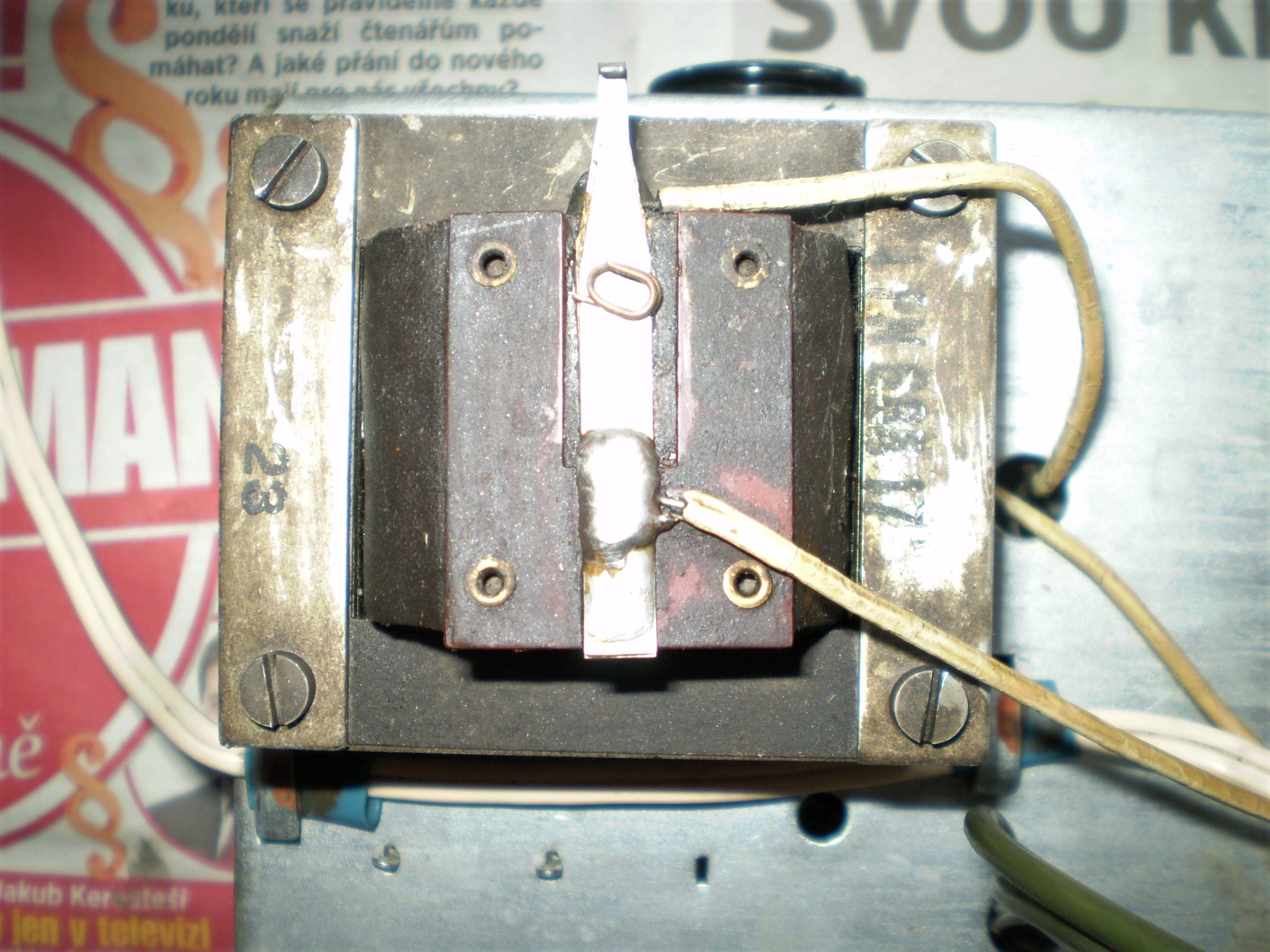 Cu drátu , což je dle mého názoru od autora náhrady silně neprofesionální. Výsledkem je , protože byl proražený selenový můstek, značné množství impregn. vosku vyteklé na spodní dekl . Naštěstí se z toho asi čudilo a někdo to vypnul, trafo se zdá ok, trochu je menší než je obvyklé izolační odpor sekundárů proti síti , cca 150 MOhm při měření ss napětím 500V ( PU311) za studena .