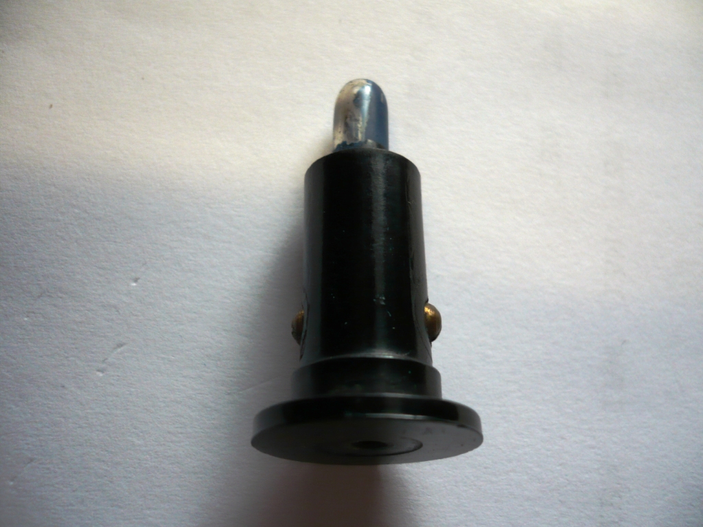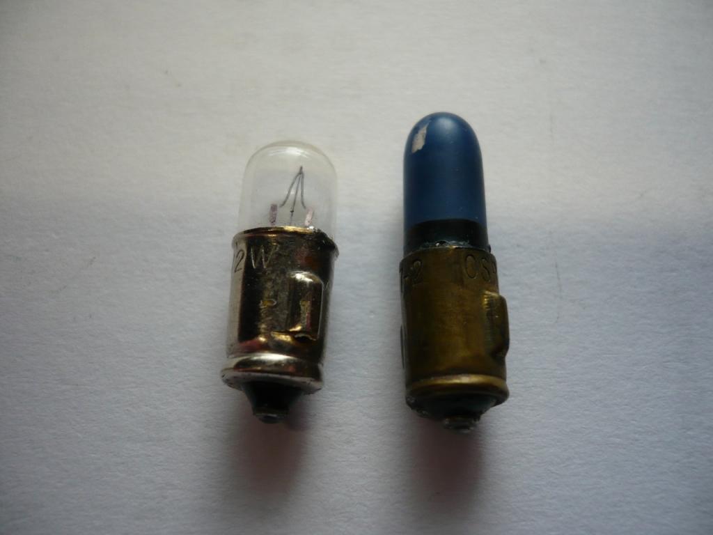 Tak tady je osvětlení FuG 10, objímka s žárovičkou se zasune do držáku v přístroji. Na druhé fotce použitelné žárovky, ta delší modrá je origo válečná Osramka, druhá je auťácká koupená v prodejně ND.