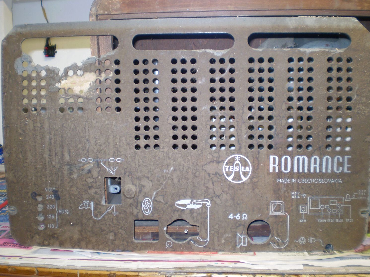 Nakonec se povedlo tu Romanci dostat do slušného stavu, rádio hraje na všech rozsazích včetně VKV na rozsahu Gramo, korekce plně funkční . Látka potahu vyčistit bez sejmutí z ozvučnice nešla, pod ní byla tlustá vrstva černého klihu a jakékoliv zvlhčení znamenalo další zhoršení - klíh prolézal látkou. Na okraji repra byly v látce tři díry , pokusil jsem se je vyspravit podlepením a vlepením vláken z okrajů - chtělo by to ale nějakou trpělivou dívčinu , já na to jednak blbě vidím, jednak nejsem zase až tak trpělivý