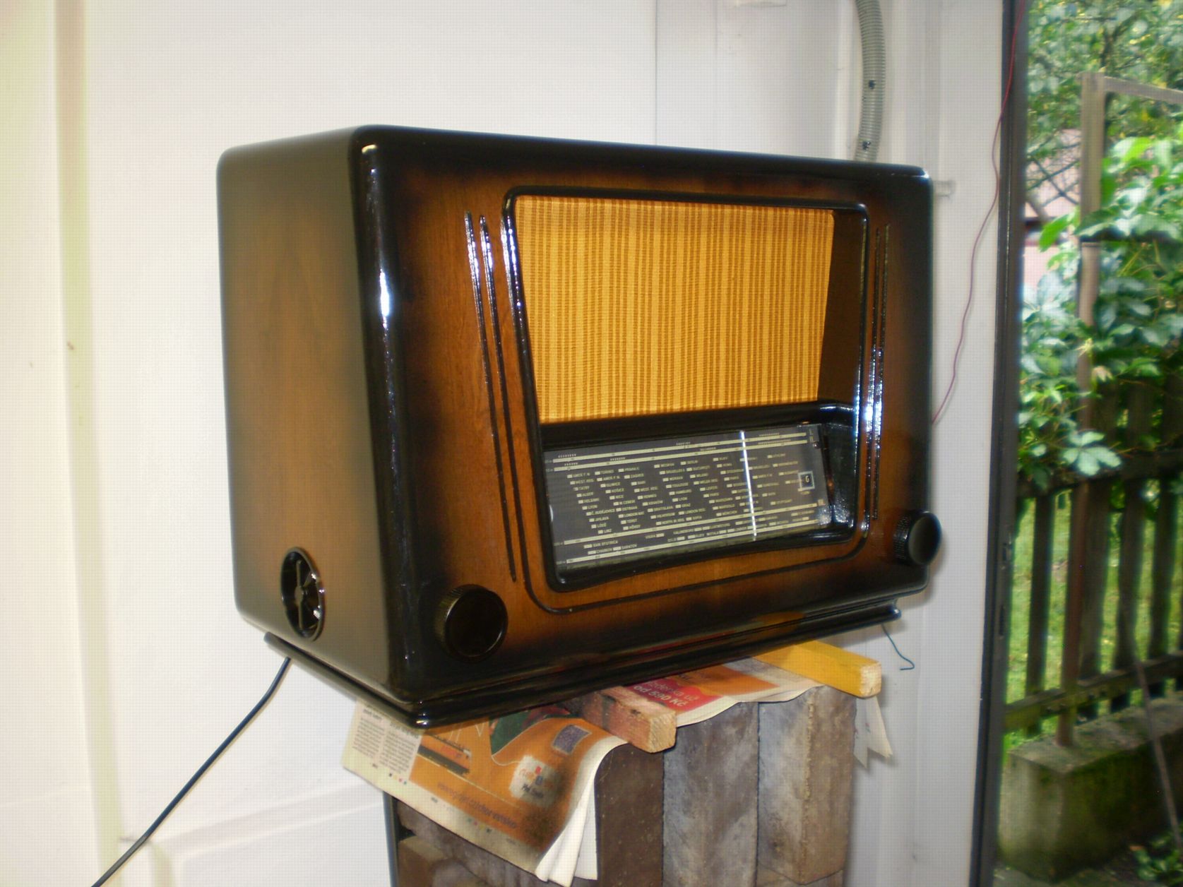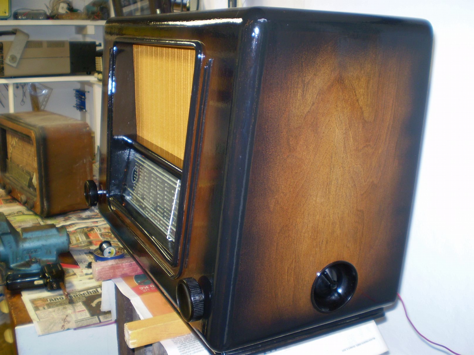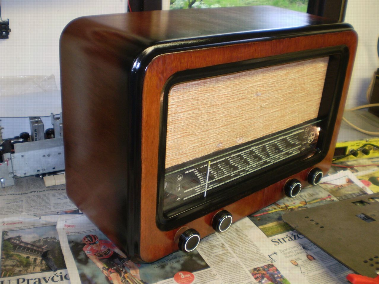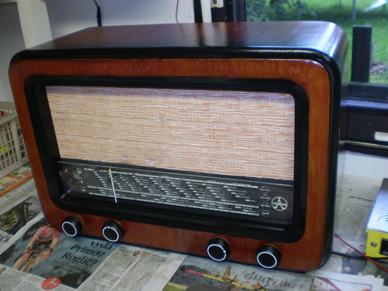 . Hodně času zabralo dodatečné izolování vodičů sítě, trafa , žárovek a magioka "odizolovaných" myšmi. Ukousaná byla též vst. cívka DV, nahrazena podobnou z nějakého jugoslávského vraku , nakonec i sladit to šlo. V dolní části vpravo kolem přepínače rozsahů jsem musel vyměnit kousek dýhy v délce cca 10 cm, bohužel jsem neměl vhodnou strukturu, tak je to vidět. Nahoře zepředu na pásku bylo hodně lepení a tmelení, kraj dýhy byl vylámán .