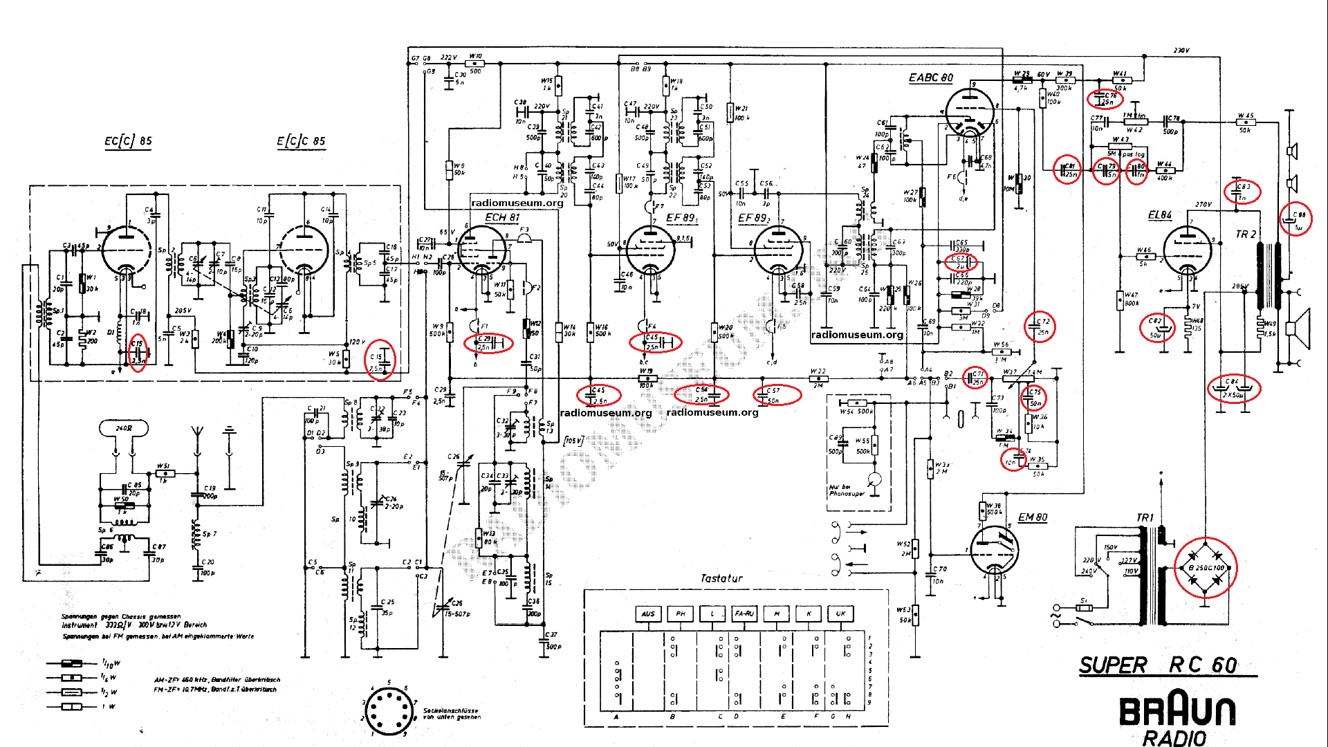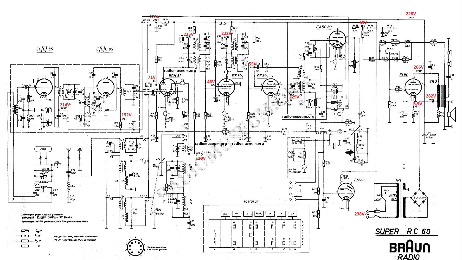 Dostal som sa k oživeniu. Rádio funguje na všetkých rozsahoch. Prikladám schému, do ktorej som zaznačil namerané napätia. Meranie som robil na rozsahu VKV. Zrážacie odpory som zatiaľ nepridával. Žhaviace napätie je len 5,9V. Žiarovky sú dve 7V/300mA (podľa pôvodných). Ten zvitkový kondenzátor do série s výškovými repro som zohnal 4,7uF/ 63VDC.