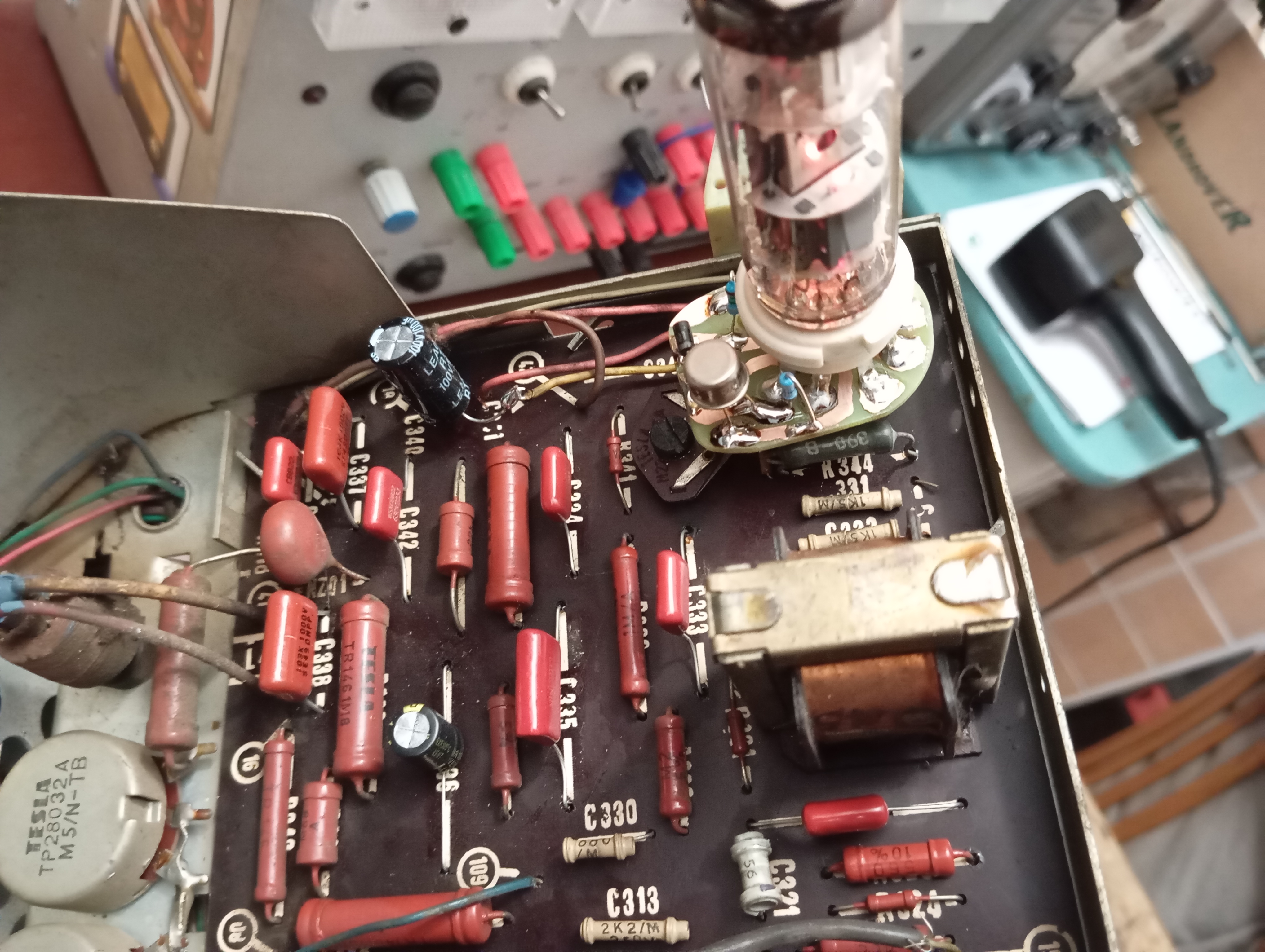 Nicméně mě zajímalo já fungují dobové opravy litaciho obrazu při nedostatku původních elektronek. Prvně jsem udělal mezipatici na PCL82. To funguje bezvadně, jen se musí trochu upravit linearita v horní části obrazu.