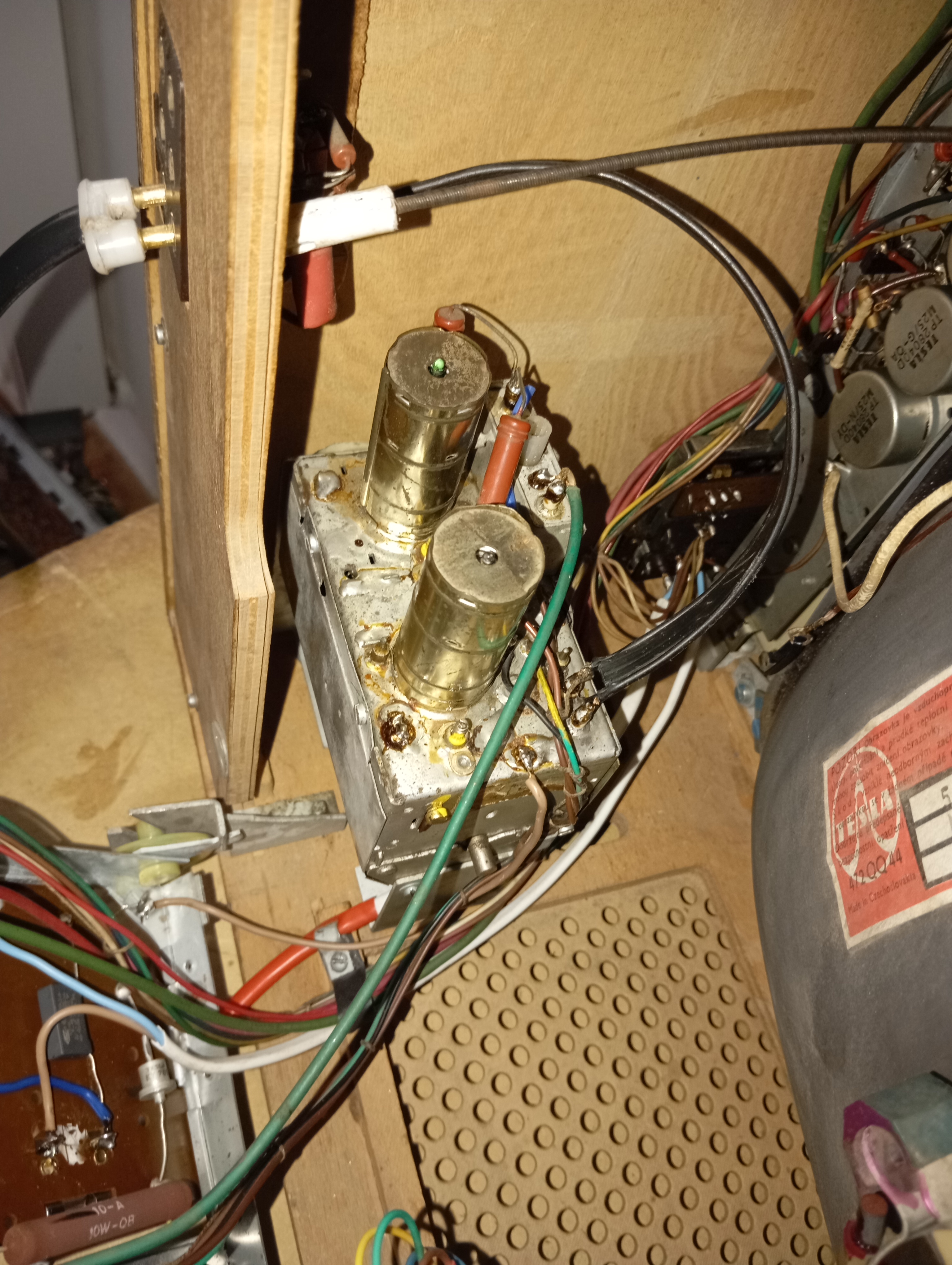 Dále tv špatně zhášela snímkové zpětné běhy i když příslušné obvody neměly žádnou vadu. Problém způsoboval snímkový výstupní transformátor. Už jsem se s tím jednou setkal u Ametystu. Trochu škoda je to, že to trafo bylo taky z novější řady, typové označení mělo na konci dvanáctku místo devítky. Odlišnost je jen mechanická v chybějících dvou úchytech. Pertinaxová deska co je na nich tedy trochu vlála, což působilo trochu divně, ale pravděpodobně to tak bylo z fabriky. Dal jsem tam klasické trafo s devítkou na konci se čtyřmi úchyty. Pertinaxová deska už tedy nevlaje.