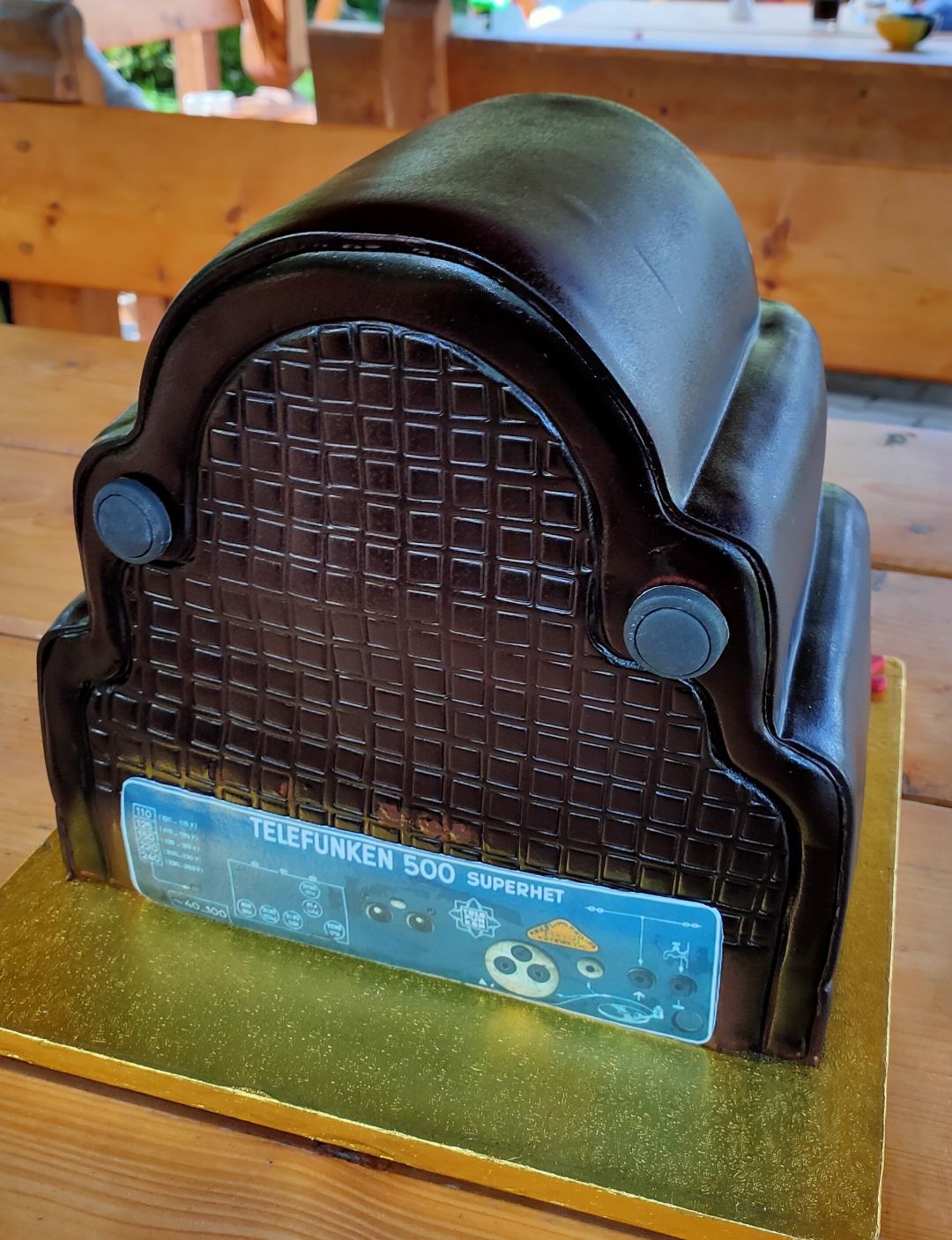nedá mi to nepodělit se s vámi o hezký dar od mého syna k mým dnešním 60. narozeninám. Dostal jsem nádherný dort ve tvaru mého oblíbeného rádia Telefunken 500 - tedy kultovní "Pětikule". Naší hantýrkou - stav přímo z výroby, vnitřek kompletní (čokoládovo malinový), jen tu REN704d jsem tam nenašel ... :D Škoda, že vám nemohu dát ochutnat, a tak posílám alespoň pár fotek zdařilého díla technicky založené paní cukrářky. Podotýkám, že zadní popis je z jedlého papíru a i ten byl moc dobrý.