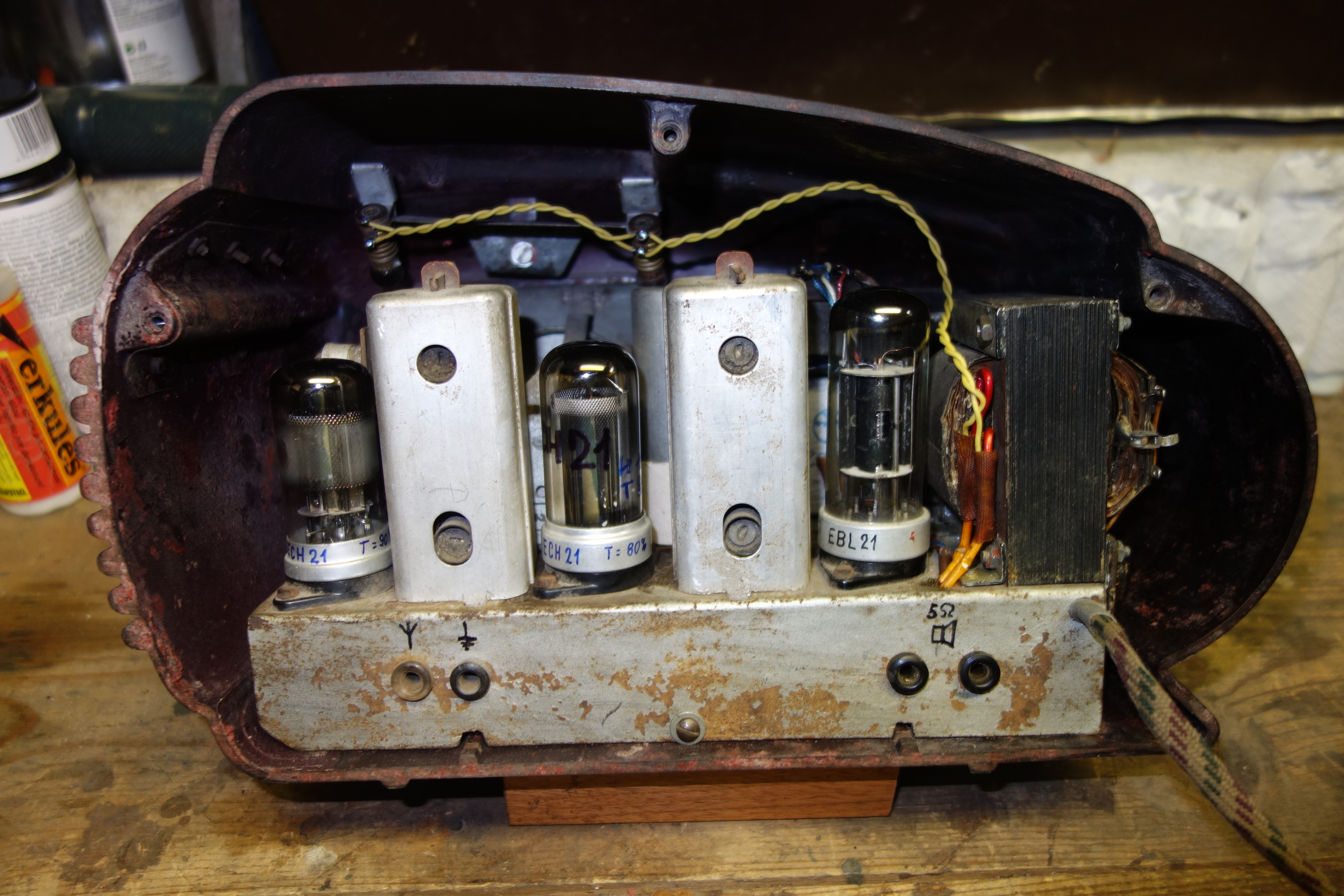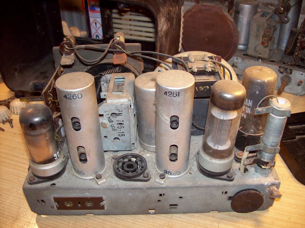 Skříňka talismanská, a uvnitř se nacházelo chassis zjevně individuální výroby. Bakelit skříňky byl rozbitý a kdosi tu skříňku zevnitř vyspravil plechovou výztuhou uchycenou prošroubováním několika zapuštěnými šrouby M4.