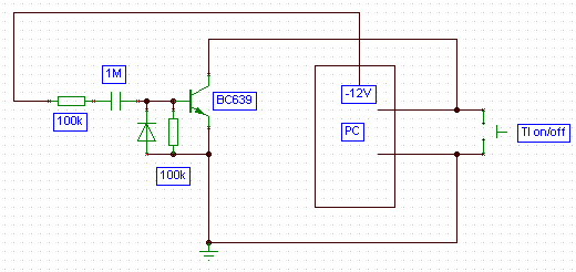 Ale k tomu udělátku - při výpadku zdroje zmizí např. i napětí mínus 12V (modrý drát) - to způsobí krátké otevření tranzistoru, který tím na okamžik zkratuje mikrospínač na PC pro zapnutí/vypnutí a PC se zapne.