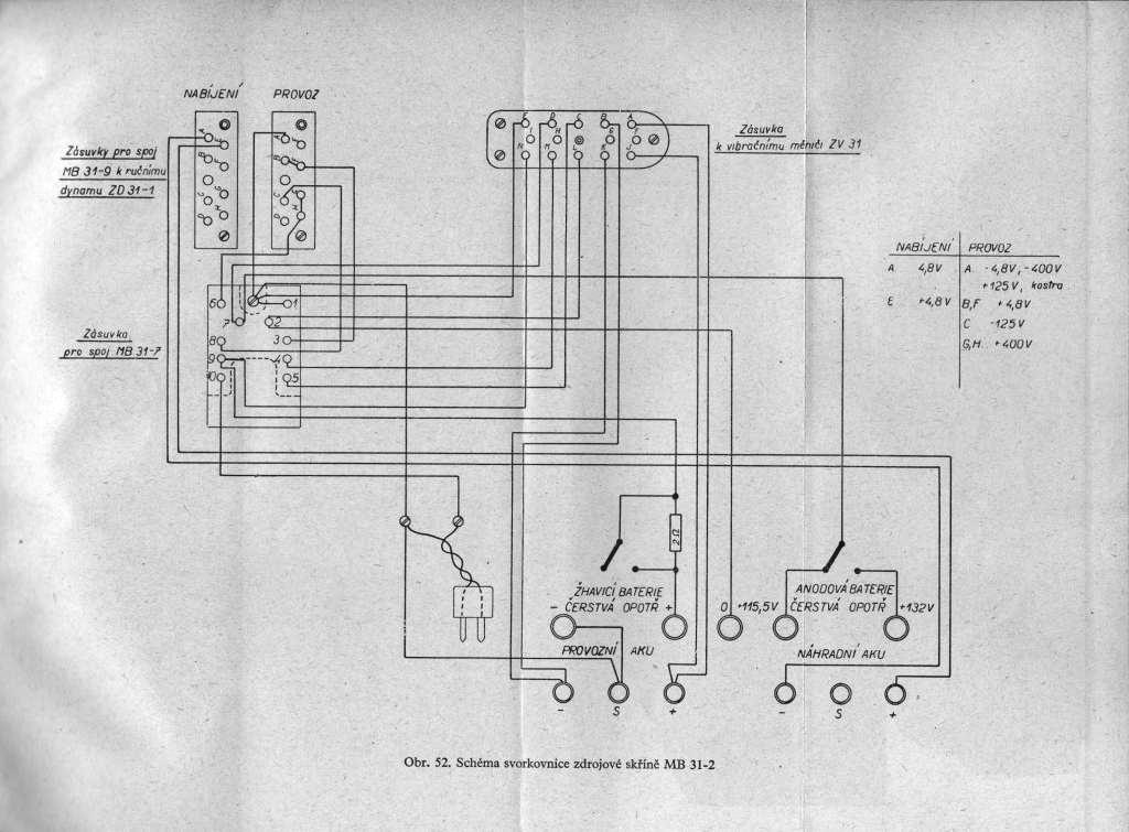 No související schémata bych našel ale pokud nemáš zdrojovou bednu MB 31-2 tak to není nic platné. Všechno je propojené přes tu skříň, včetně ručního dynama ZD 31-1 které napájí vysílač stanice a dobíjí baterie v té skříni...
