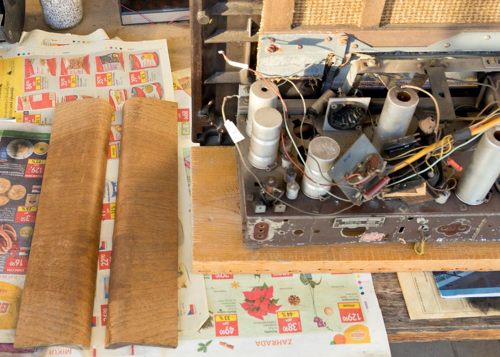 Zkoušel jste si to vyndat z bedny a odmontovat treba z toho celniho bakelitoveho stitu ty zaoblene drevene dilce po stranach? Ja jsem to kvuli prebrouseni a prelakovani rozebiral... Oddelit ten bakelitovy stit od sasi jsem se uz nepokousel, nevim kolik prace by dalo vymenit stupnici... Ta drevena de...