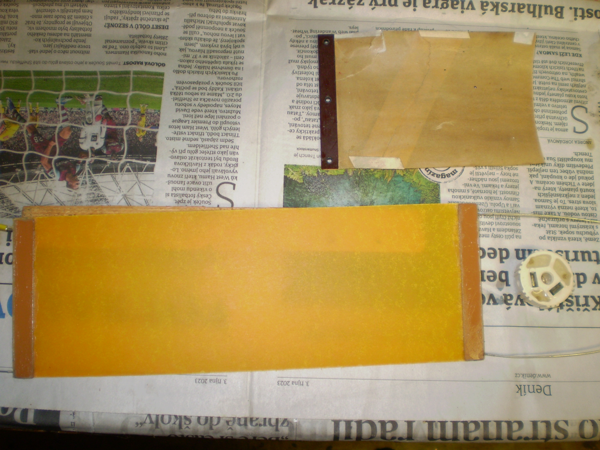 Možná ještě fotka - nový papír má kraje z pl.spoje 1mm ,dráty na nich jsou letovány a pásky jsou přilepeny Chemoprenem Extrem . Proč dráty na upevnění a ne původní provázky ? To poznáte, až to tam budete dávat