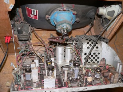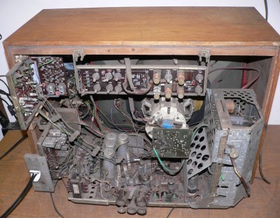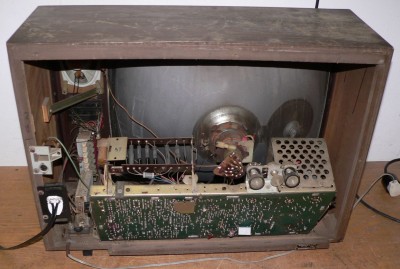 Konkrétně u tohoto kusu se bedýnka ještě leskne, ale má nuž nějaké oděrky. Synchronizace není úplně stabilní, zejména cca prvních deset minut se kmitočet oscilátoru postupně posouvá do konečné polohy. Obrazovka dobrá, zvuk perfektní, zprovozněn i vypínač na potenciometru hlasitosti. Postupem času vyměněna většina kondenzátorů v rozkladech (myslím, že i upravovány některé hodnoty), vzhledem k tomu, že většina oprav pak probíhala improvizovaně v místě provozu, není to úplně čistým způsobem (viz foto). Bez všech krytů, ale na druhou stranu myslím, že bych našel i návod k použití.