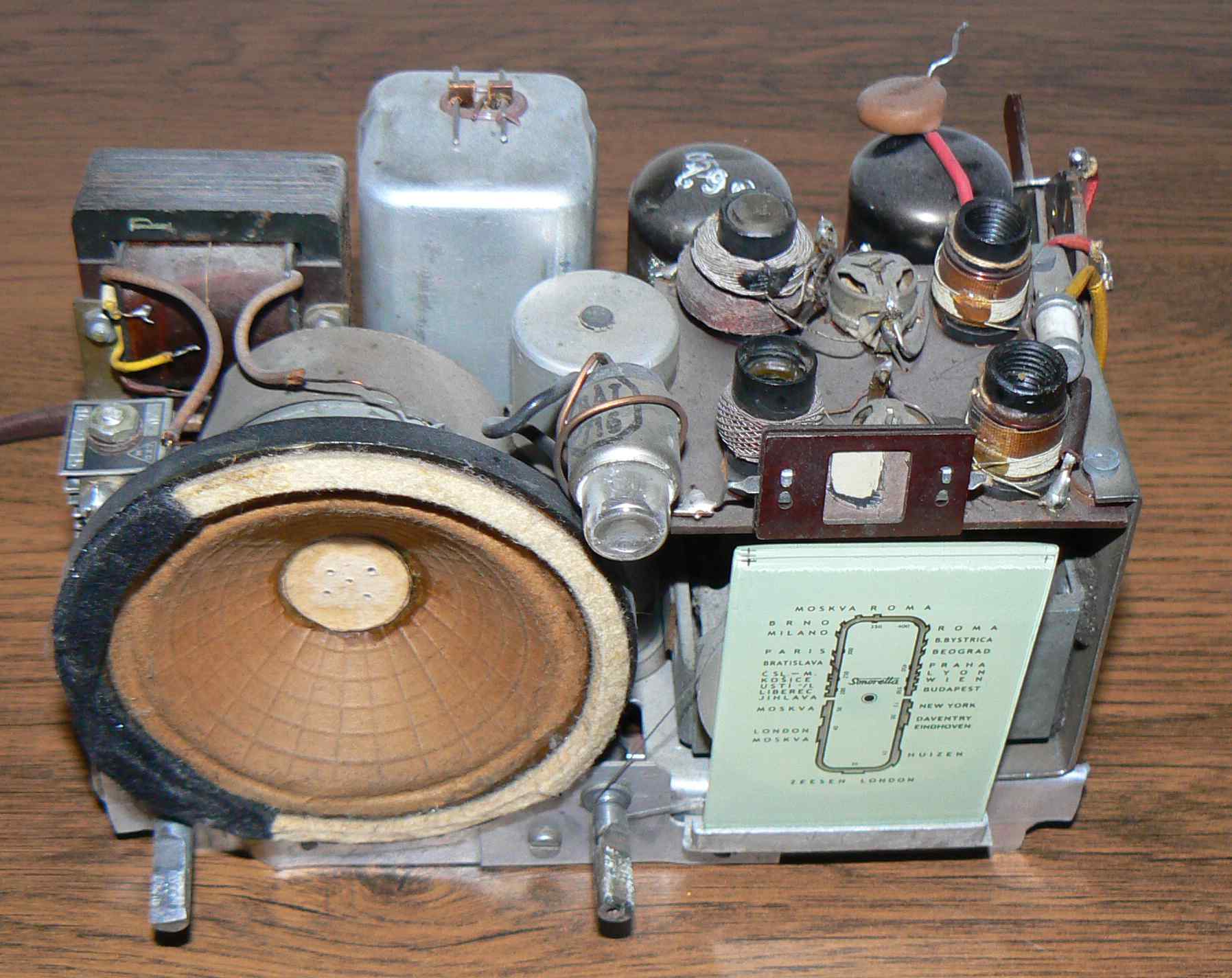 Ještě jsem zjistil, že sokl na AZ11 je přišroubován pod šasi a pro něj ručně vypilovaný otvor má tak říkajíc "fousové rozměry", takže hrozí nebezpečí, že se některá pružina soklu nebo kolík elektronky dotknou šasi. Takže "výtopna" AZ11 půjde asi pryč, jinak by se tam totiž nevešel výstupák. Ten původní byl zřejmě namontován na reproduktoru a já jiný vhodný reprák než z Hadexu nemám.