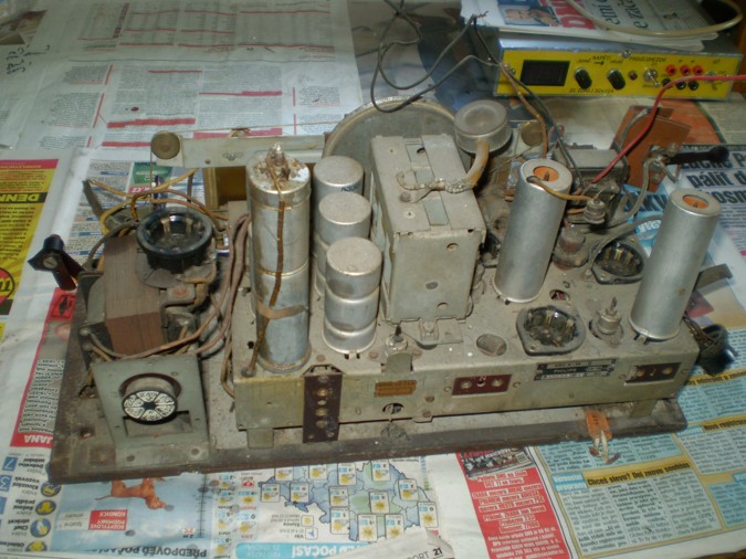 vpředu i jakž takž šasi - zde je však samozřejmě již prožraný sáknoucí původní elyt , elektronky nastrkány dvě ECH4 místo ECH3 a EF9 , EBL1 nahrazena na drátech visící přesoklovanou EBL21 , chybí zadní stěna a páčka vlnového přepínače , a bohužel , opět prohořelé síťové trafo - mezi sekundárem a žhavením AZ1 je izol.odpor menší než 10 k a mezi sekundárem a jádrem cca 100k již při napětí 100V , s 500V prakticky zkraty. V rádiu jsou kupodivu KV cívky.