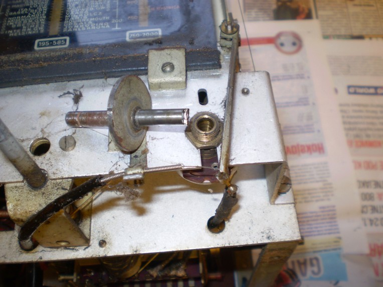 doprava přes tvarovanou kulisu šroubovanou na hřídeli potenciometru .Celé to bylo zablokované a hřídel potenciometru šla vytáhnout. Důvodem byl upadlý běžec potenciometru uvnitř asi v důsledku zablokování lanovodu a pokusu "protočit to". Potenciometr je dost zvláštní , jezdec i hřídel jsou spojeny s kostrou a odporová dráha je asi jen 1/2 dráhy , zbytek běhá jezdec jen po pertinaxu . Fosforbronzový jezdec jsem na hřídel nasadil a zaletoval a ani přitom netratil ten mrňavý uhlíček...