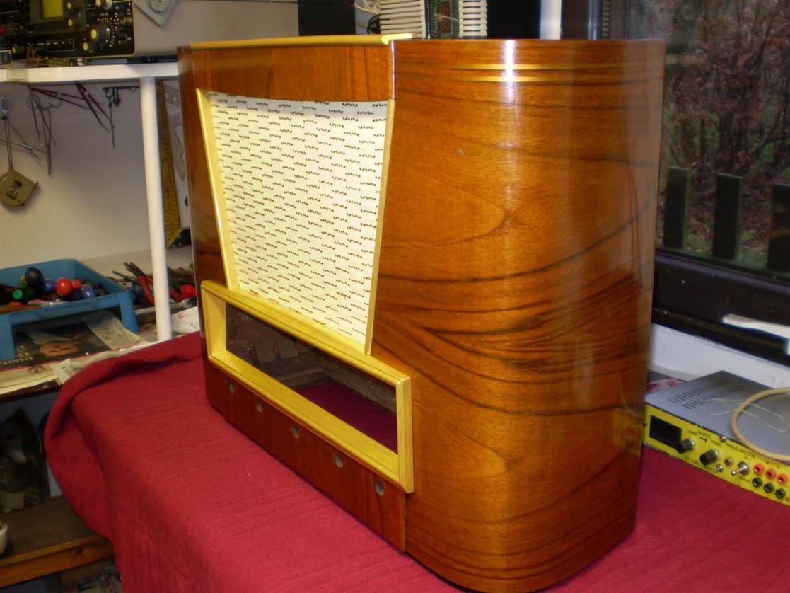 8. Po uschnutí otočeno na perlince a vyšponováno . Ozvučnice byla po odlepení zbavena klihu kartáčkem a vodou a usušena pod zátěží, aby se nezkroutila . Je pravděpodobné , že kdyby byla z překližky, bude se muset dolepit a srovnat, tady to třeba nebylo. Ozvučnice po usušení napuštěna ze strany látky 2x ředěným bezbarvým Lazurolem , aby z ní něco nepřelezlo do vlhké látky.