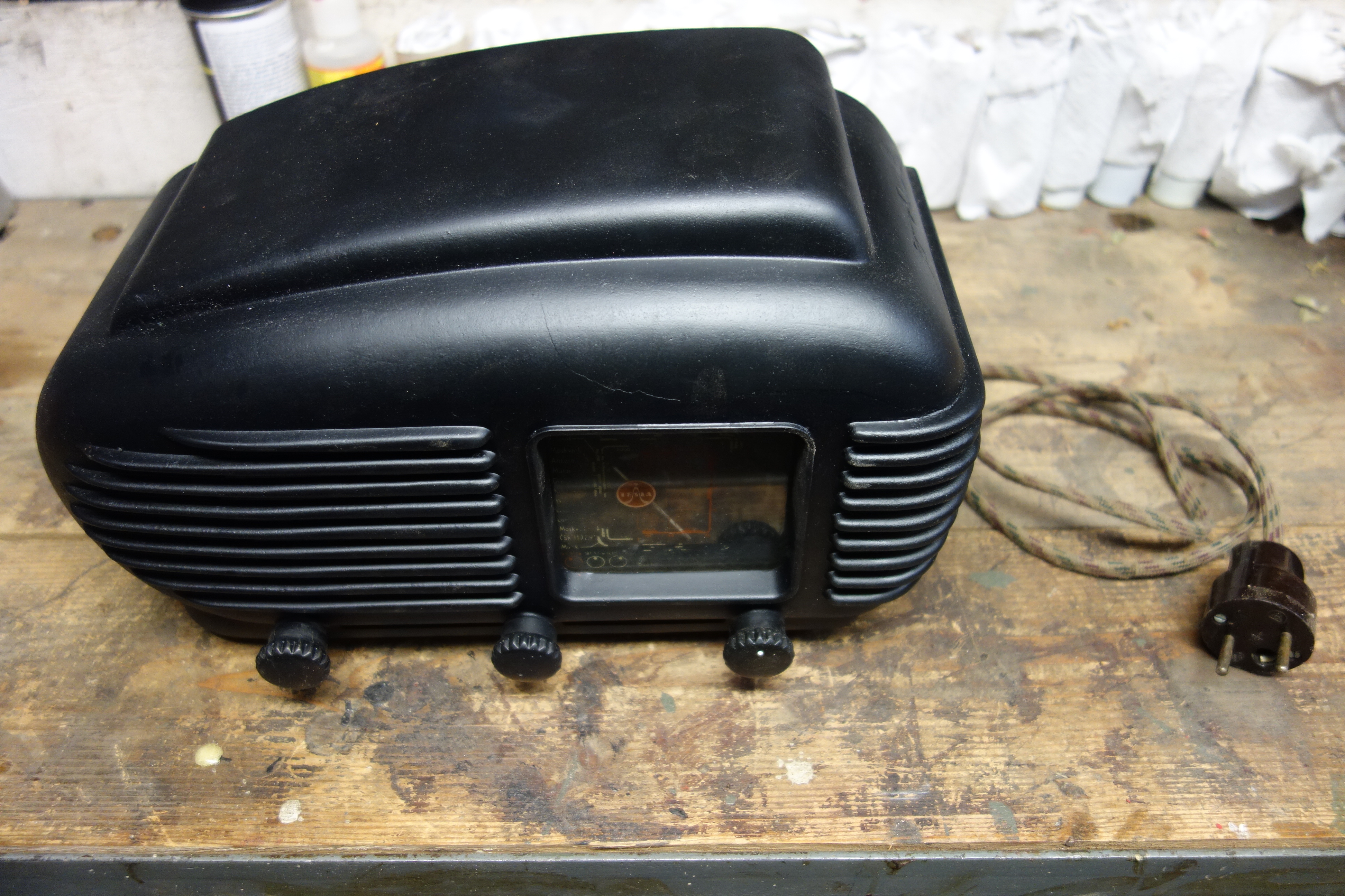 Dohromady pak byla skříňka slepena jakýmsi dosti pevným lepidlem, nastříkána hrubým rudohnědým tmelem, přibližně obroušena a nakonec přestříkána hluboce černou matovkou. Spolu s černými knoflíky německého původu (Torn.E.b?) a částečně smytou stupnicí mohl být tento přístroj stylovou výbavou smuteční síně libovolné pohřební služby.