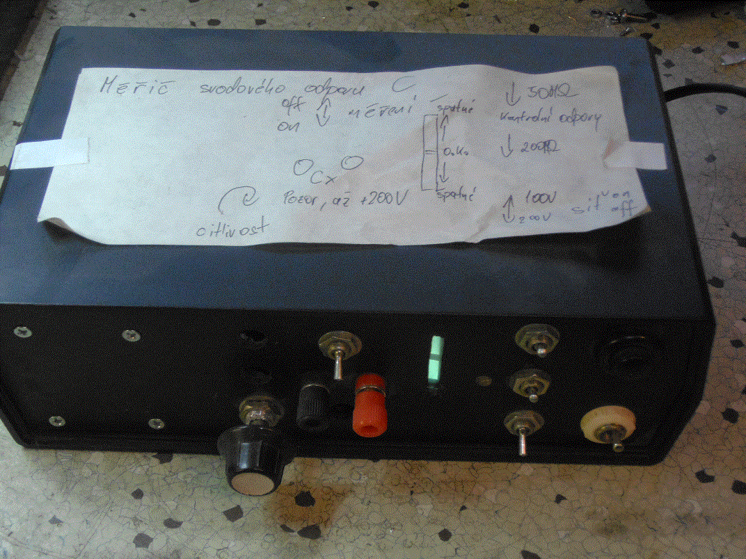 na základě článku v starším díle Radiojournalu jsem taky vyrobil svůj měřák na svody kondenzátorů. Má to přepínání zkušebního napětí 100/200V i vypínač tohoto napětí, kromě toho jsem doplnil o kontrolními rezistory 50M/200M, tím pádem i možnosti nastavení citlivosti na maximální výchylku, což je vidět i na obrázcích, když přepínač 50M je zapnut.