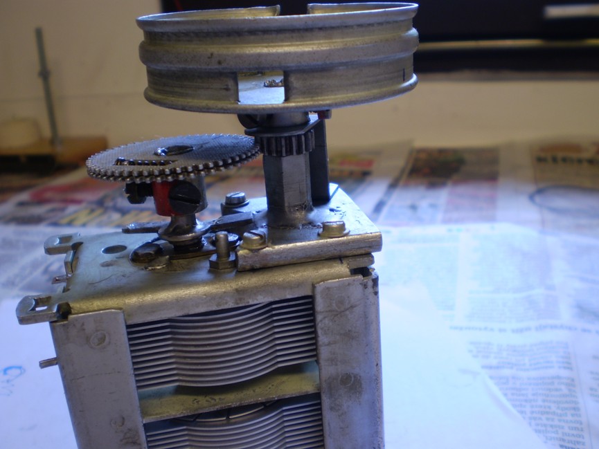Zjištěna podstatná vada převodu ladícího kondenzátoru , viz obrázek , slitina se drobí , budu to muset nějak nahradit, jiný domeček neseženu a stejně by byl asi v podobném stavu .
