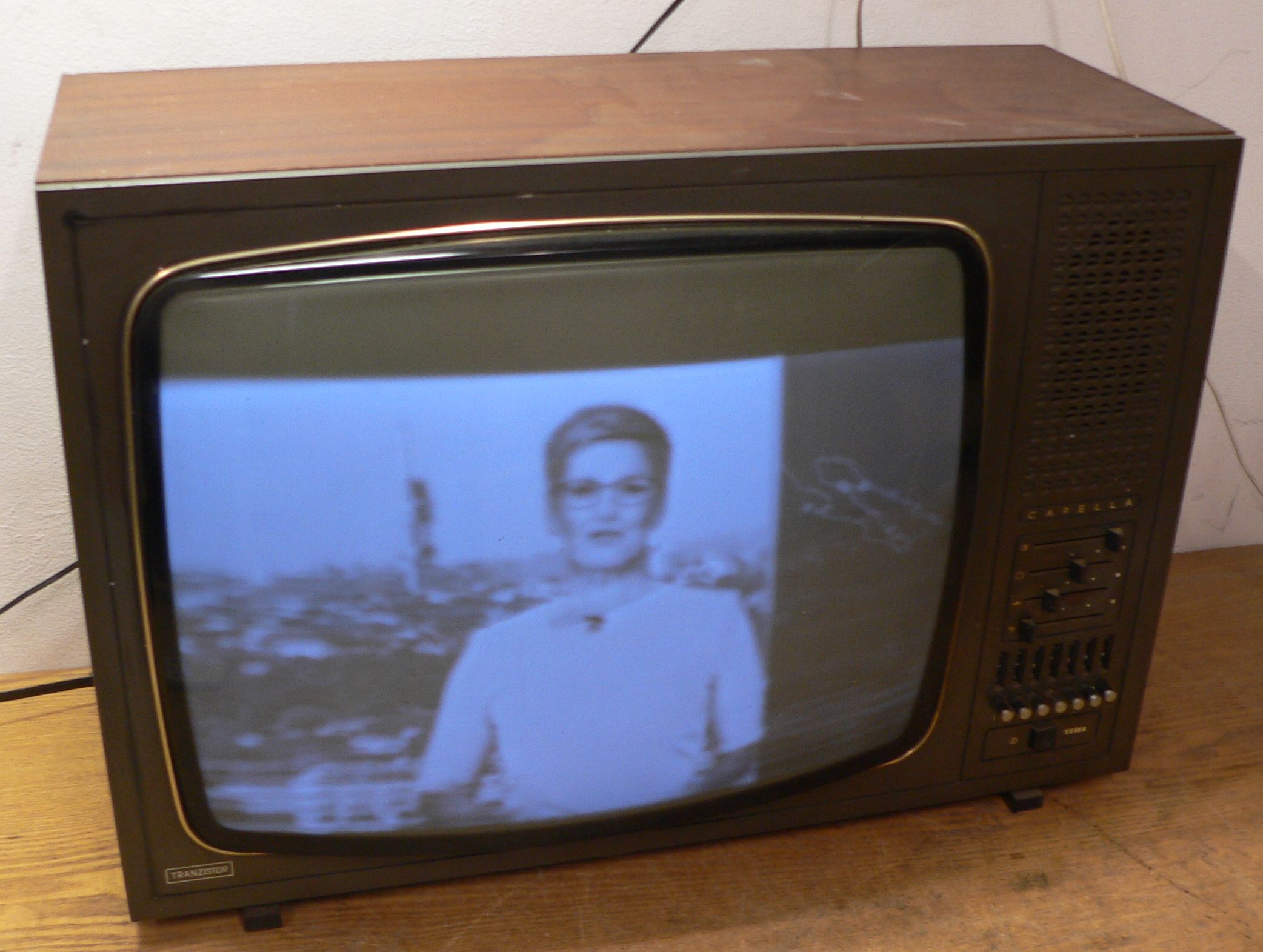 S rozprodejem tedy nepřestávám a vydražené peníze převádím na plenkové konto pro Tomáška. Další na řadě je výše uvedená Capella, která je stejně stará jako já. Je sice také provozuschopná, ale její obrazovka je velmi špatná, nekoukatelná. Proti tomu jsou věci jako posunutý obraz ve svislém směru úplné drobnosti. Bedýnka v dobrém stavu, nahoře pár šrámů a "mapa" zřejmě od obligátní vázy s kytkou. Co mne zaujalo je, že čísla na okénku pro IV. a V. pásmo jsou číslovány 21 30 40 (a ne tuším 21 40 61 jako to bylo běžné). TV ladí ale normálně včetně V. TV pásma.