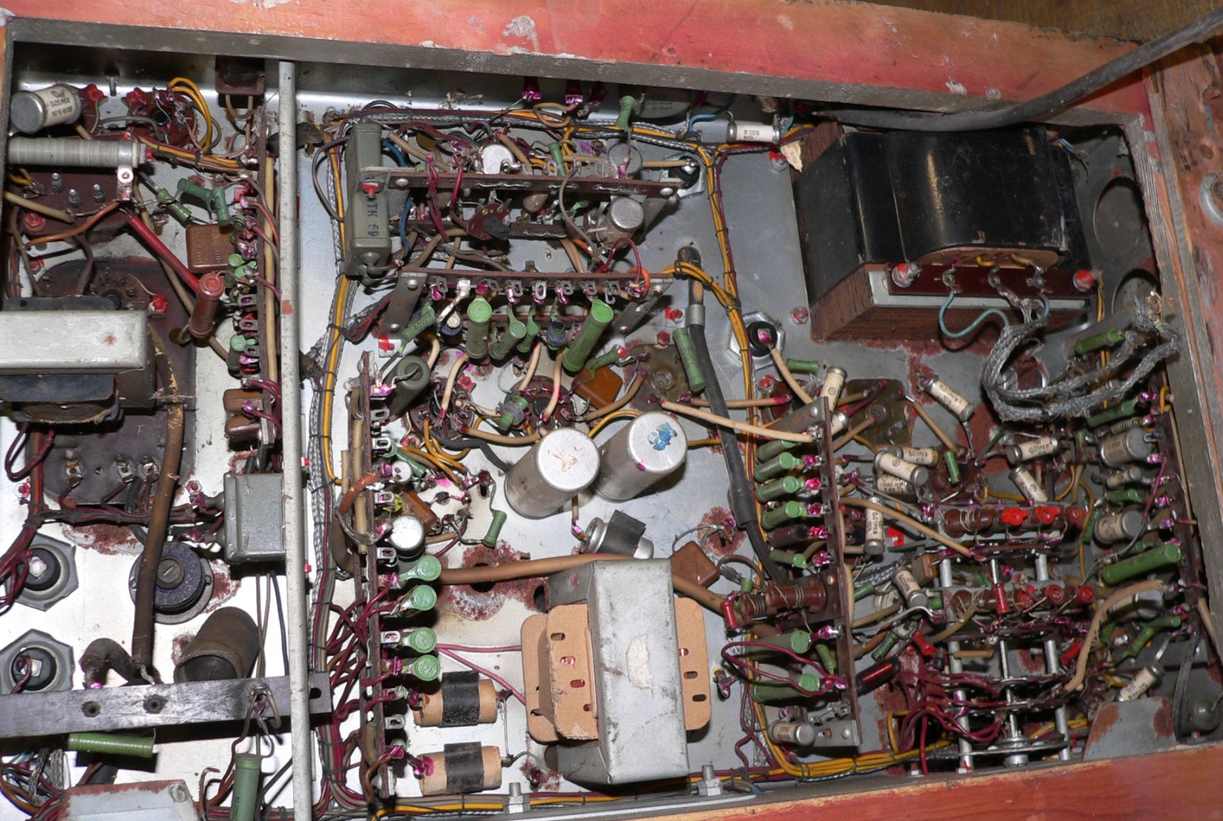 Jinak tenhle kus je v takovém nějakém slabším průměrném stavu. Bedýnka je díky poctivému lakování v solidním stavu, má pár škrábanců, na hranách popraskaný lak. Až na několik elektronek a zadní stěnu kompletní. Šasi na několika místech orezlé. Nezkoušeno, ale bude to minimálně na výměnu některých výkonových rezistorů v anodovém rozvodu a nějaké elyty.