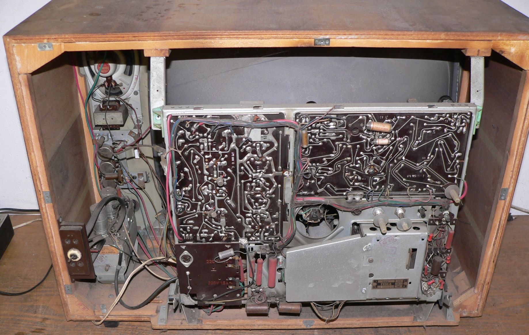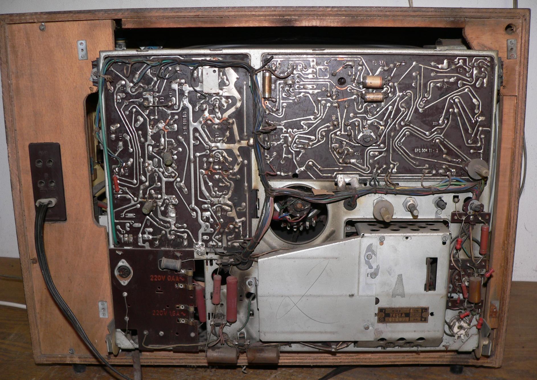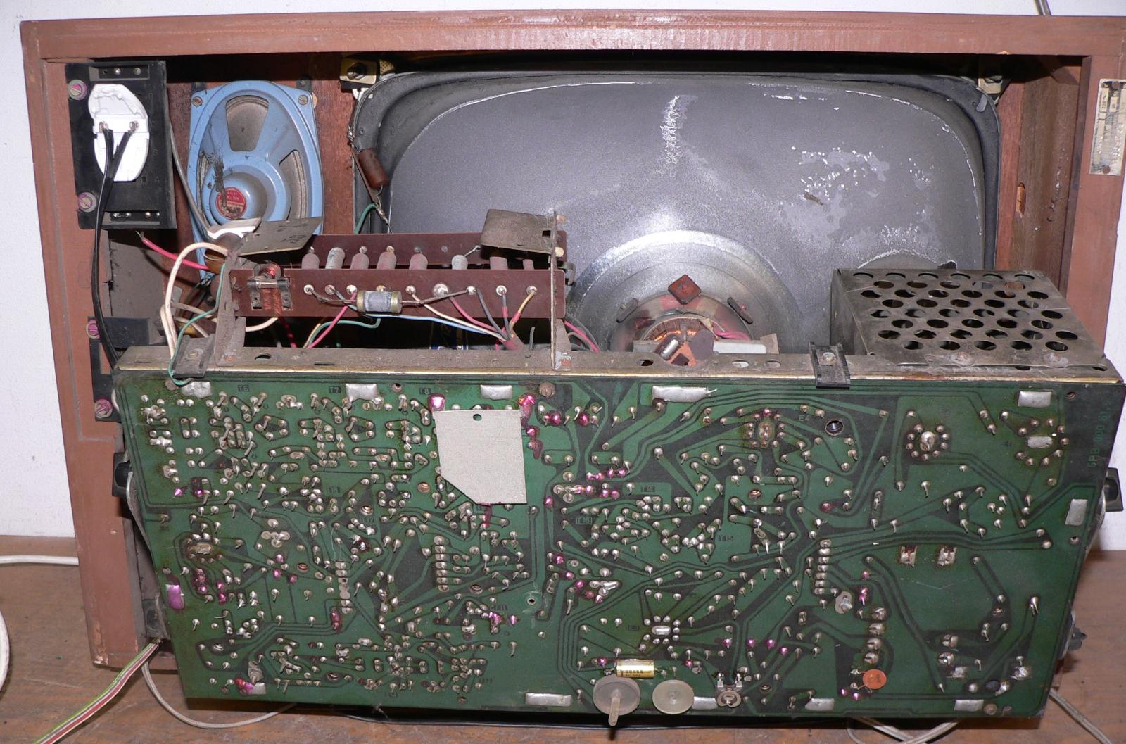 U tohoto kusu potenciometry dost šustí, ale zvuk i obraz jsou až na obvyklou nelinearitu perfektní. Vyměněn jeden proražený kondenzátor ve VN a provizorně opraven kontakt na patici pro PCF200. Možná proto je obrazovka perfektní, neboť moc spolehlivě fungovat nemohla - u té patice už z výroby je zřejmě ohnutý jeden pin, neprochází skrz desku. Bedýnka pěkná, bohužel schází zadní stěna.