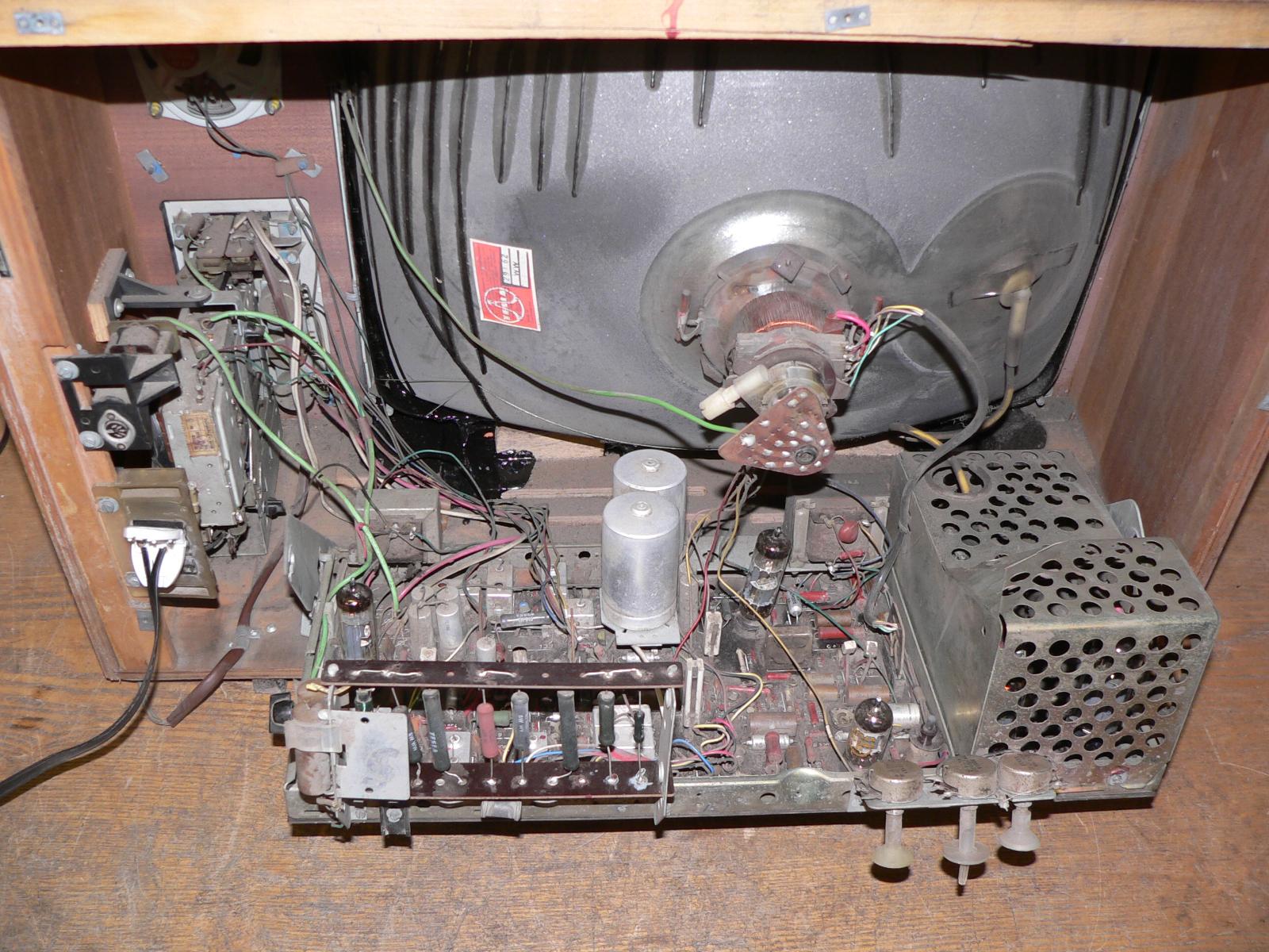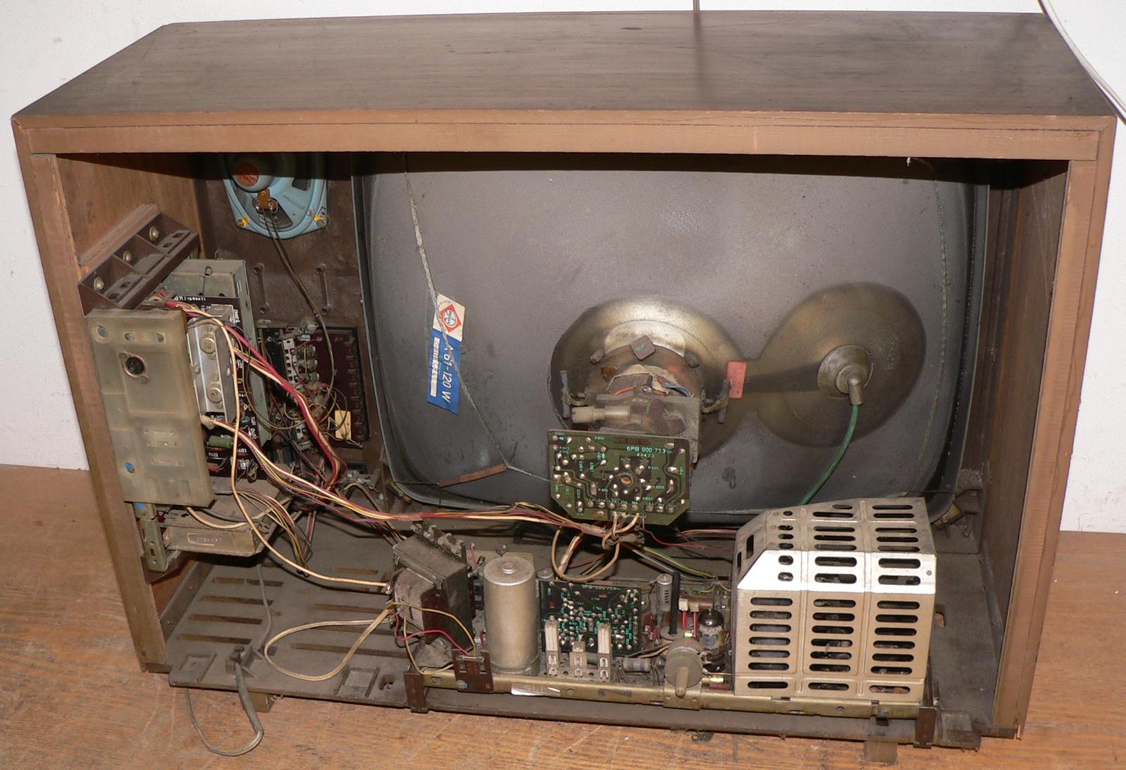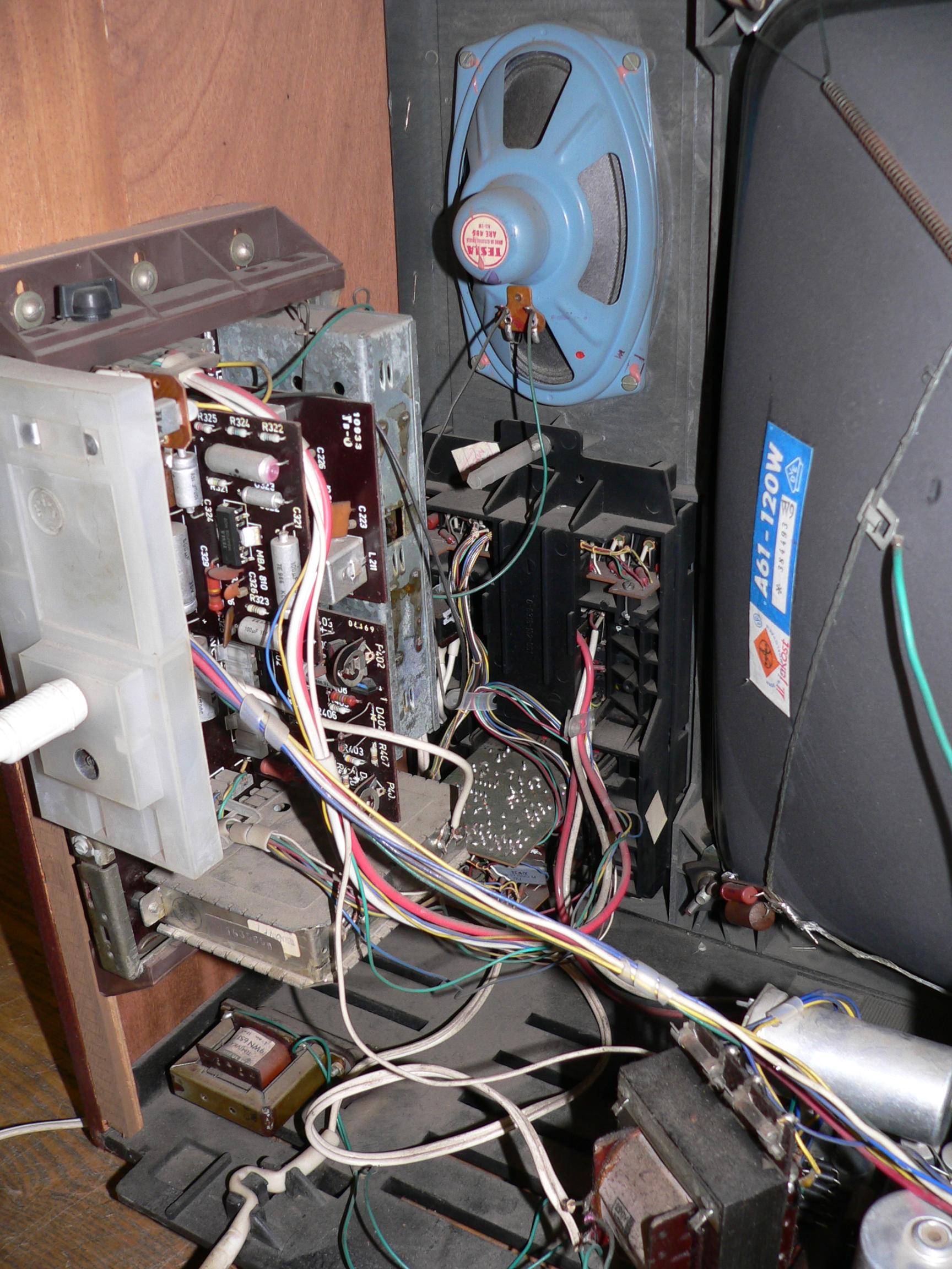 Pak tu mám 4245U Martino, to jsem získal až zde ve středních Čechách, v těch jižních se tehdy vyskytovaly prakticky jen Spoleta (těch jsem měl také několik). U tohoto kusu je vyteklá ale za pokojové teploty ztuhlá hmota kolem obrazovky, kanálový volič má mechanickou vadu - po stisku nelze otáčet s žádným hmatníkem (ladící kondenzátor je ale normálně pohyblivý, pokud není stisknuta žádná předvolba, lze s ním normálně ladit. Na něm schází tři hmatníky (nejsou ulámané dají se vyndat. Dále jsou provizorním způsobem nahrazeny oba filtrační elyty, všechny jejich části byly bez kapacity. Obrazovka má sice solidní jas, ale je rozostřená (co si vzpomínám, tak ty Spoleta byly také, zřejmě se do stavu obrazovek nepromítá ani tolik provoz jako výrobní série). Bedýnka je částečně rozeschlá, nic moc.