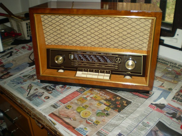 Tak konečně hotovo viz obrázky, původní lak přebroušen za mokra a přelakováno. Některé "rány" ve dřevě holt i přes tmelení atd. jsou vidět, no nesmí se na to koukat moc zblízka :) . Rádio je plně funkční až na slabé magioko,
